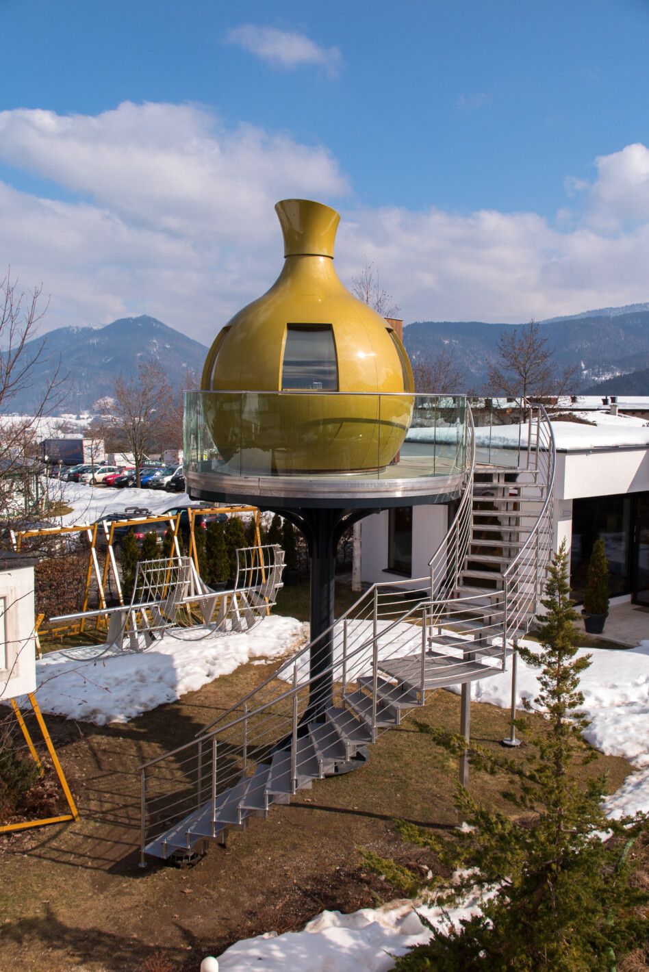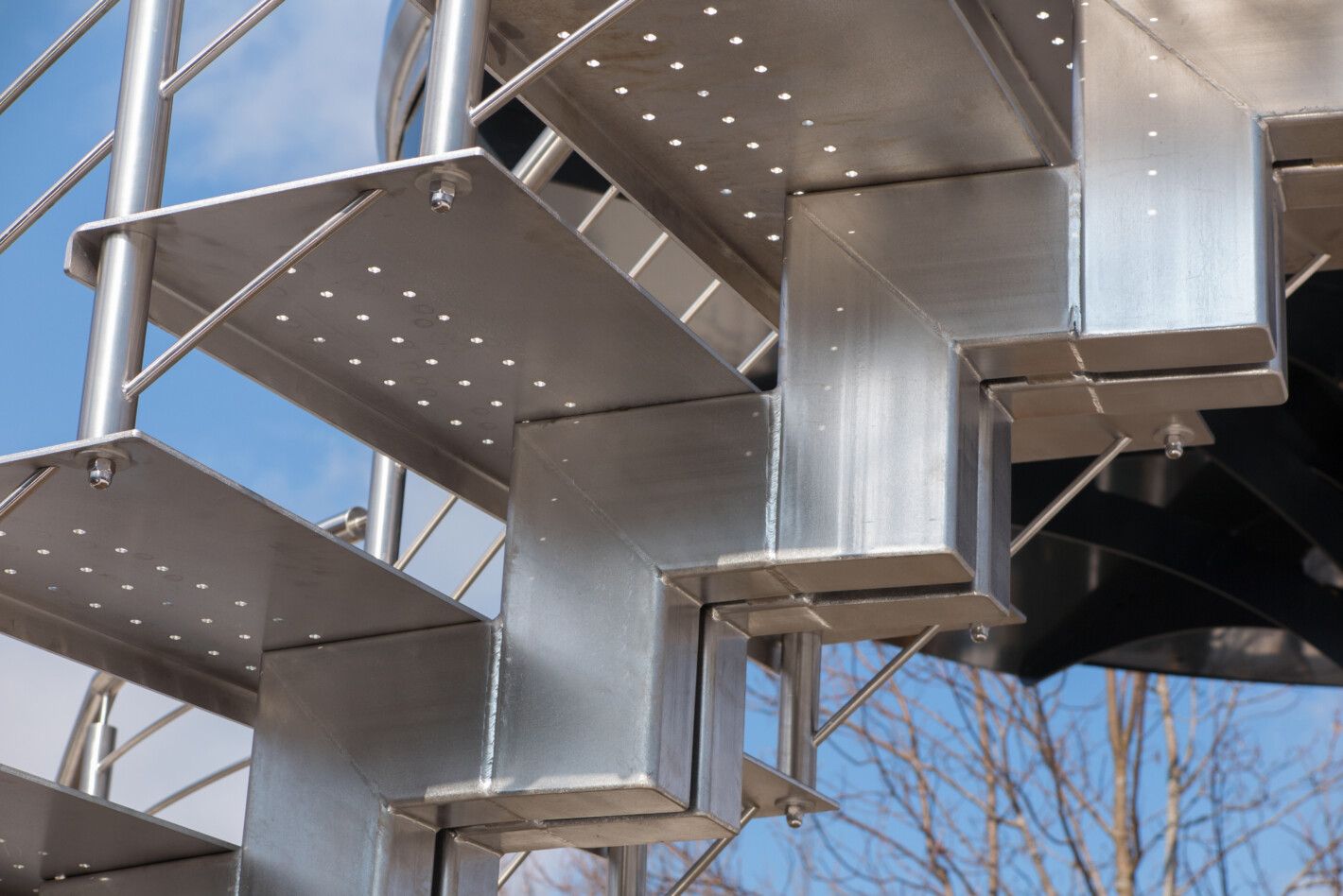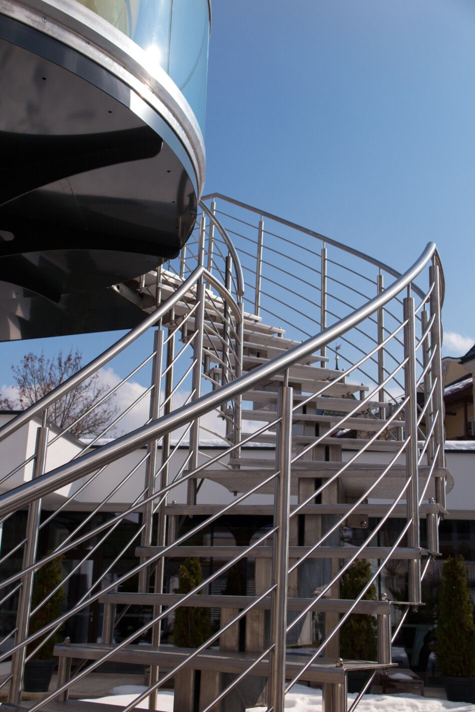 Doppelmittelholmtreppe abgetreppt komplett aus Edelstahl, Trittstufen aus massiv Edelstahl gelasert, Edelstahl Relinggeländer, Führend zu einer drehbaren Sauna, in einem 4* Wellnessresort montiert