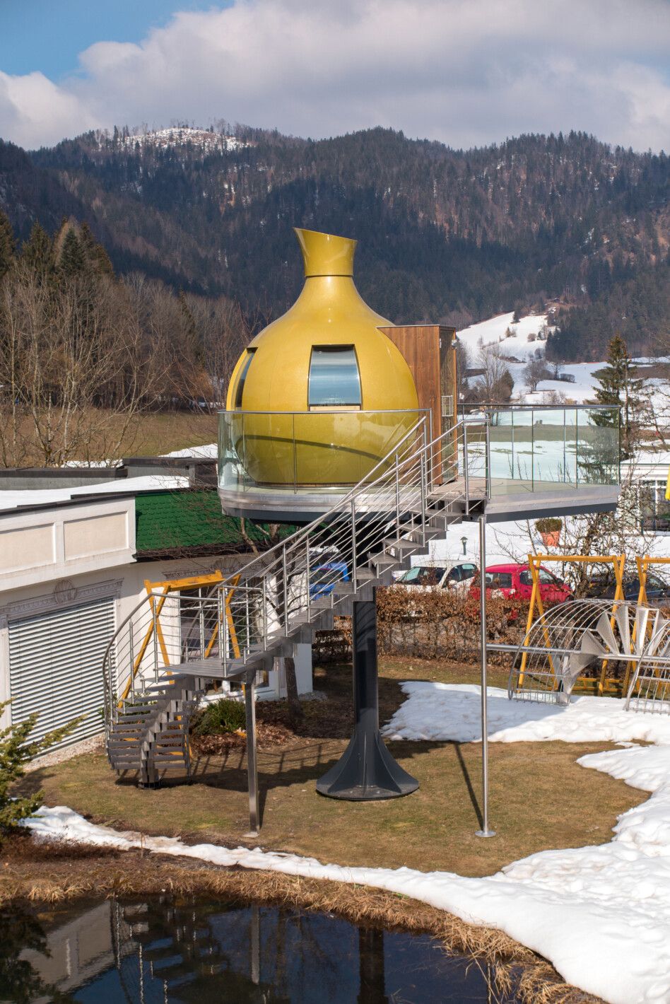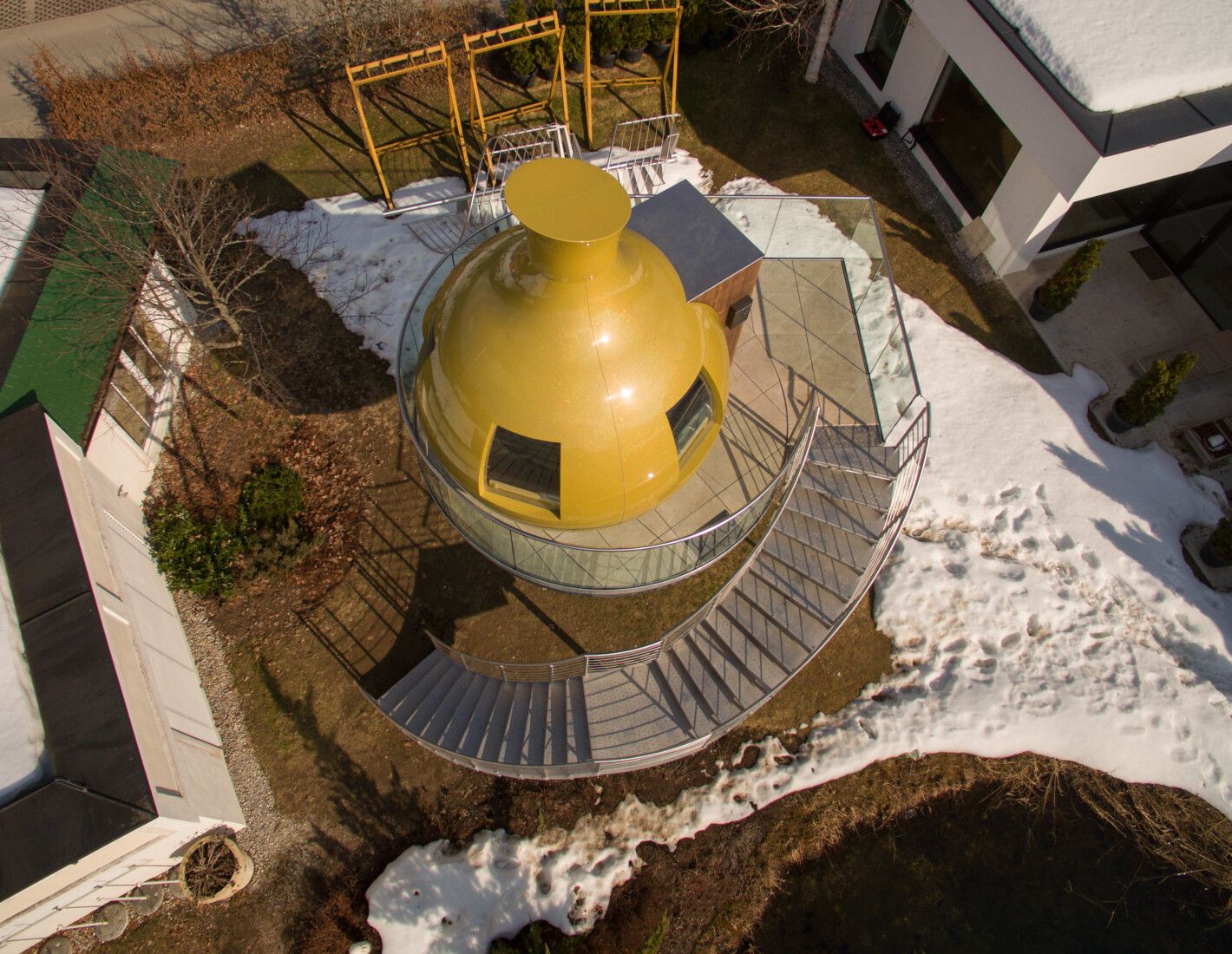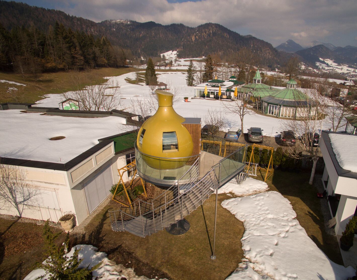 Doppelmittelholmtreppe abgetreppt komplett aus Edelstahl, Trittstufen aus massiv Edelstahl gelasert, Edelstahl Relinggeländer, Führend zu einer drehbaren Sauna, in einem 4* Wellnessresort montiert