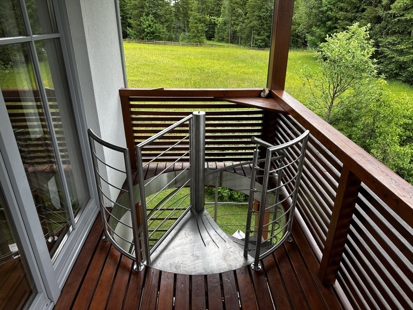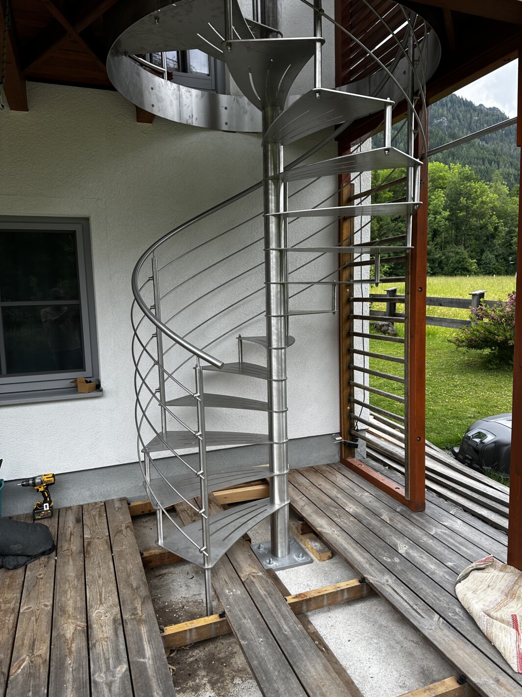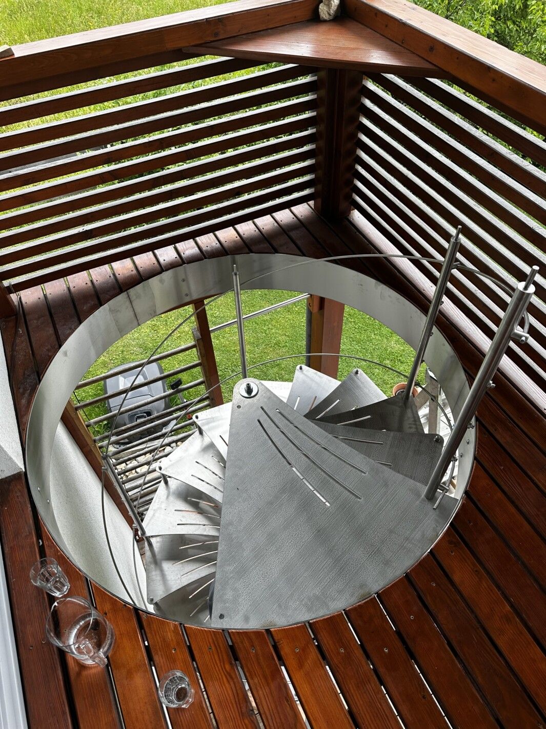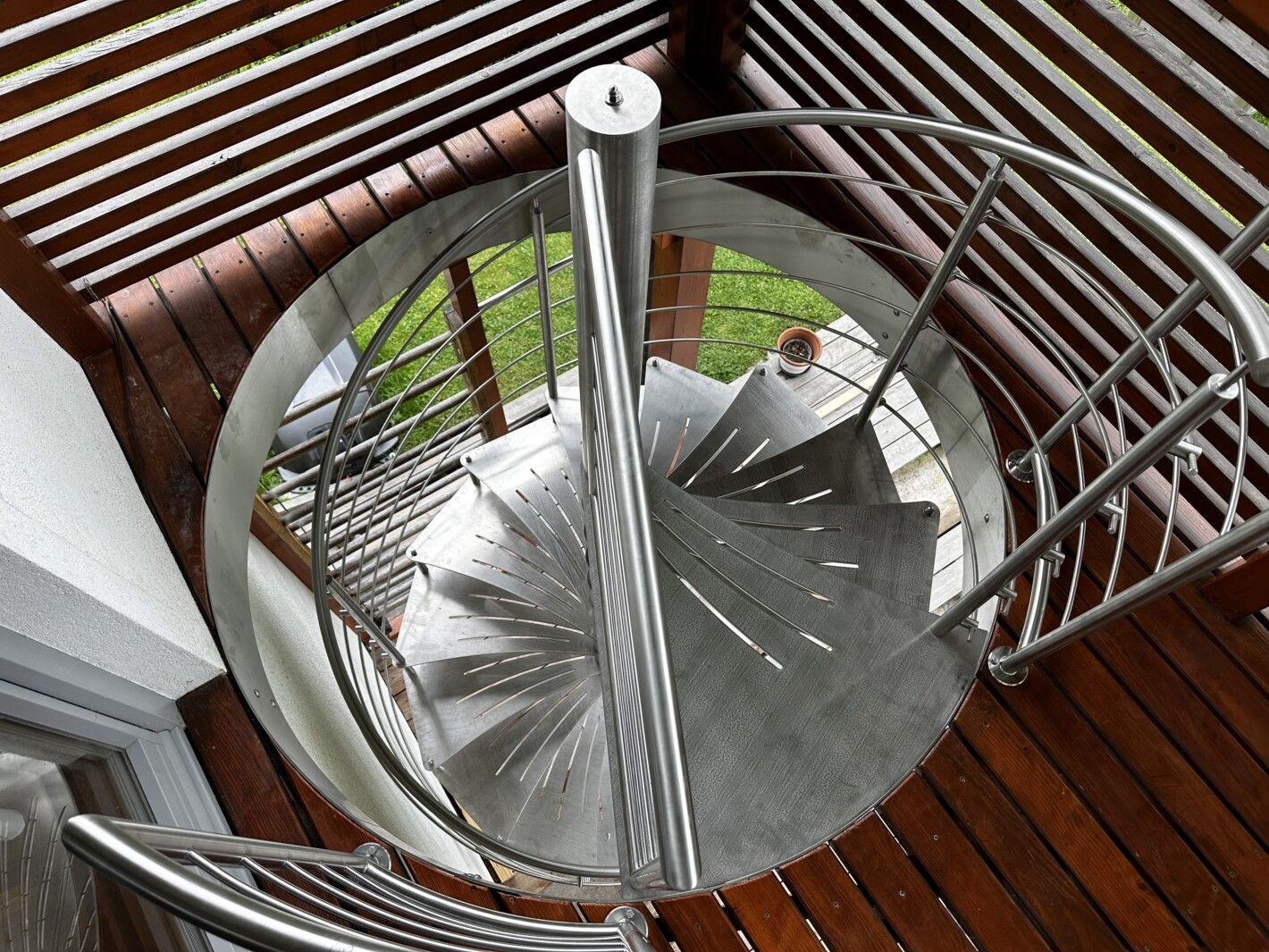 Edelstahl Spindeltreppe mit Relinggeländer, Trittstufen massiv Edelstahl mit anti-Rutschstreifen gelasert, Edelstahl Relinggeländer mitlaufend