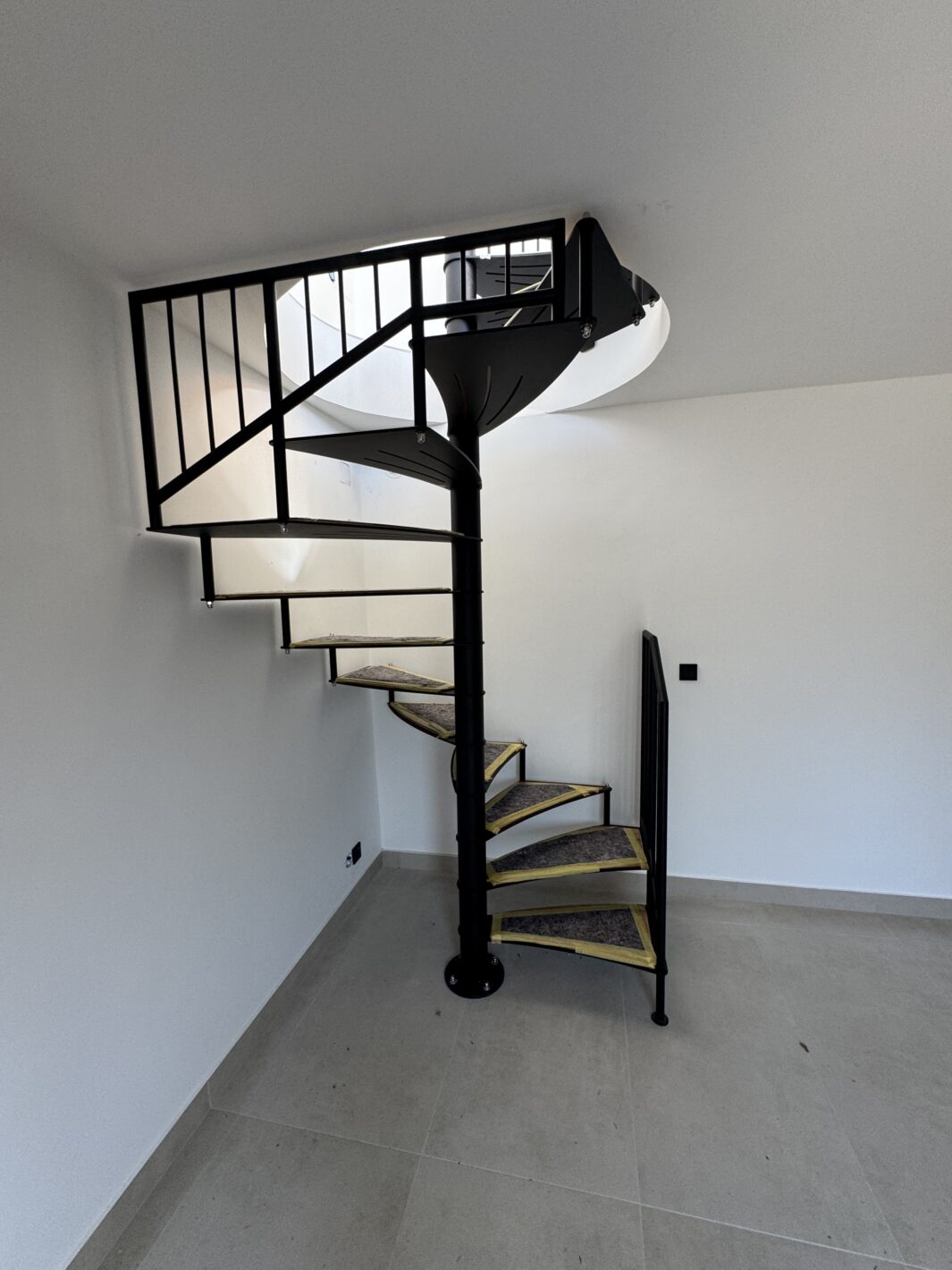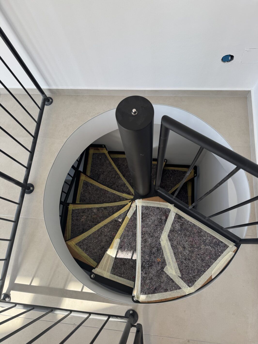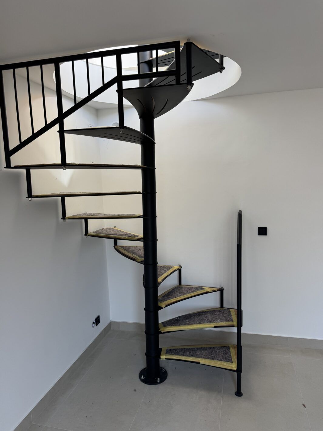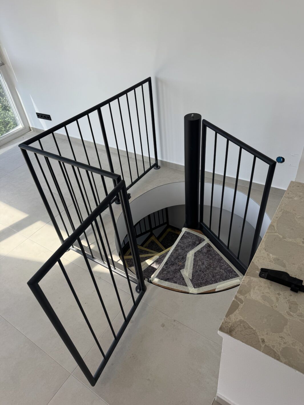 Edelstahlspindeltreppe schwarz RAL pulverbeschichtet, Trittstufen aus 8mm Edelstahl gelasert, belegt mit massiven Eichenbelag 20mm