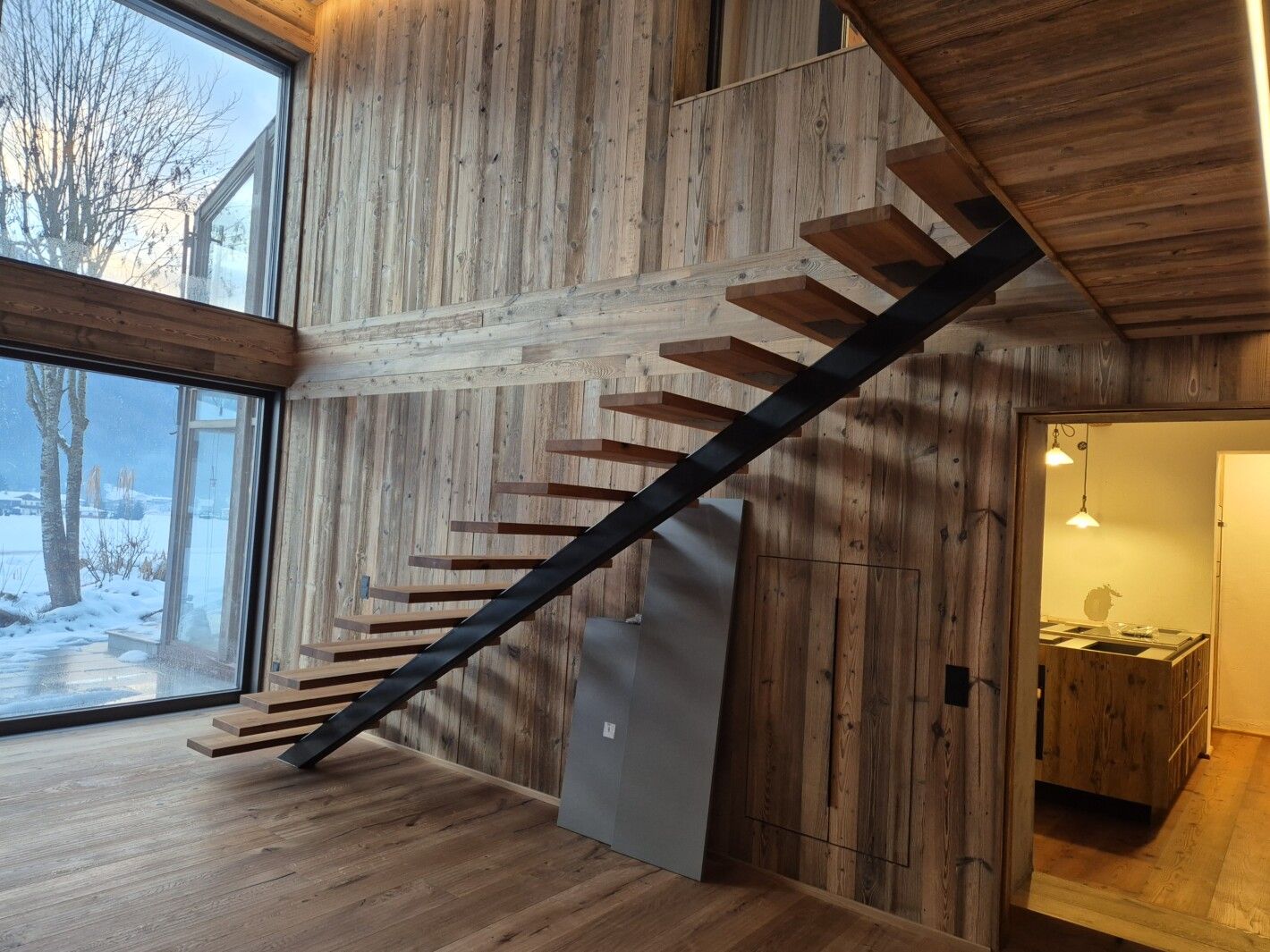Mittelholm Treppe Salzburg, nach RAL pulverbeschichtet Trittstufen Eiche rustikal 50mm massiv Auflagefläche auf Unterseite Trittstufe eingefräst