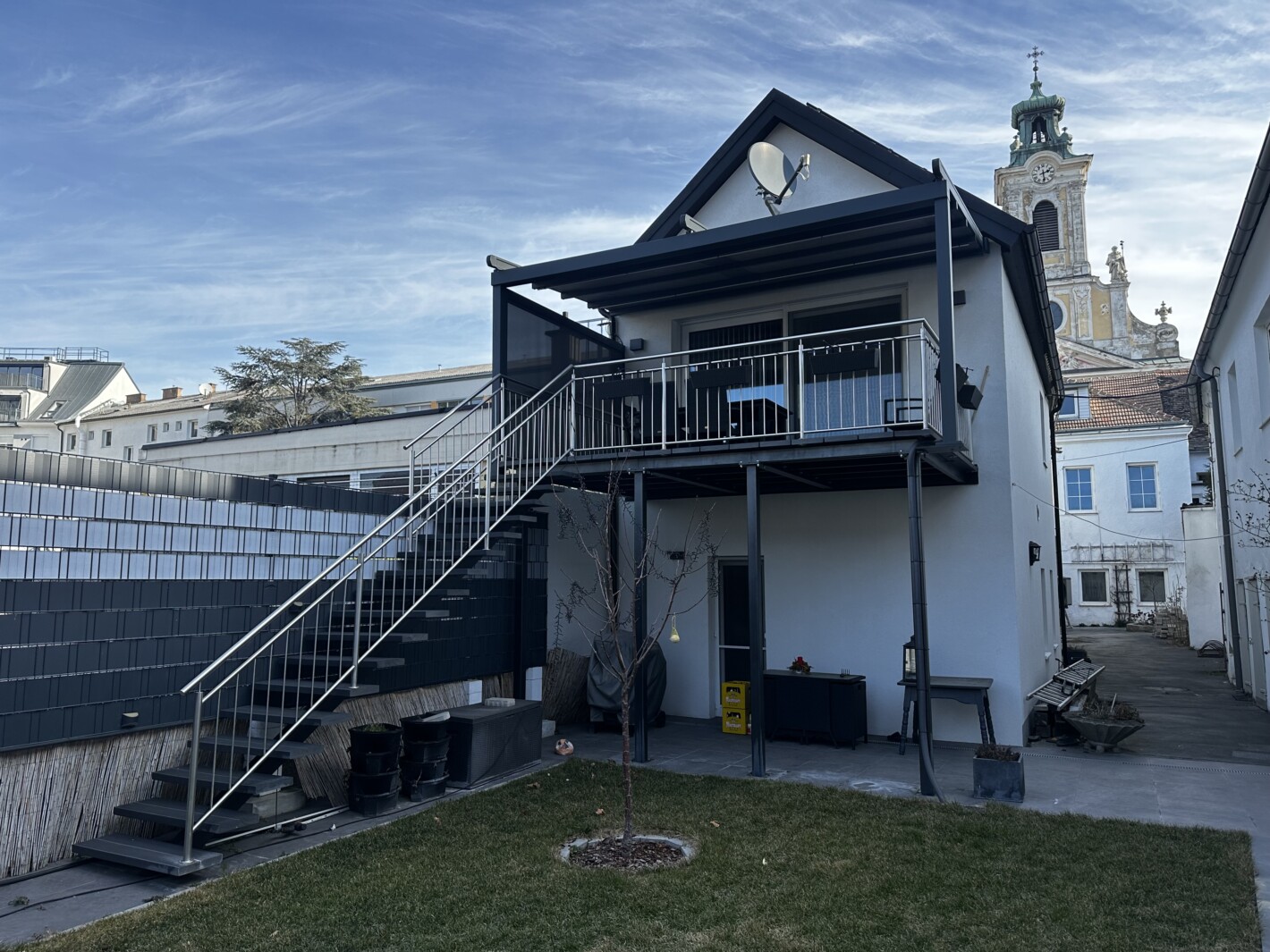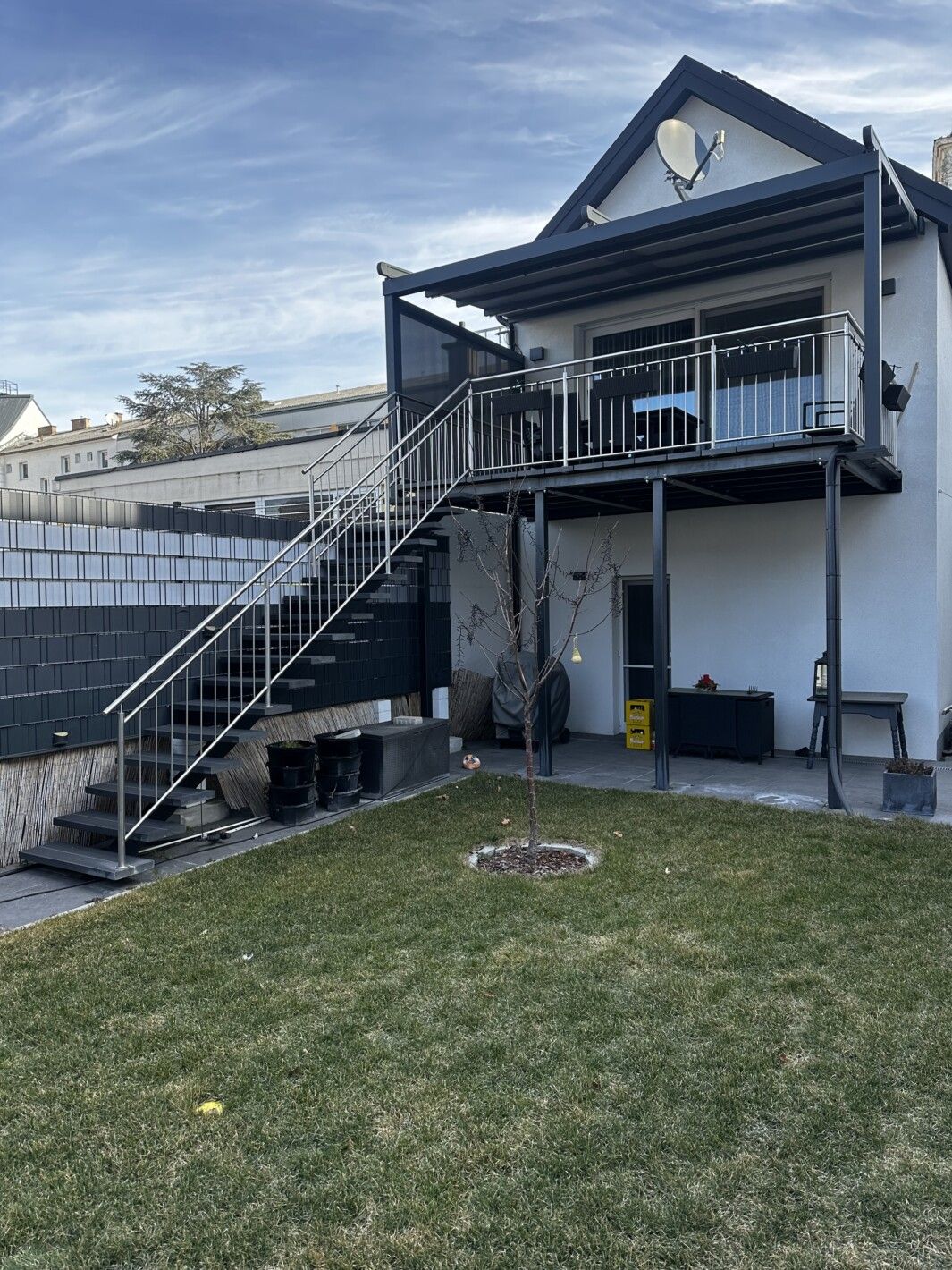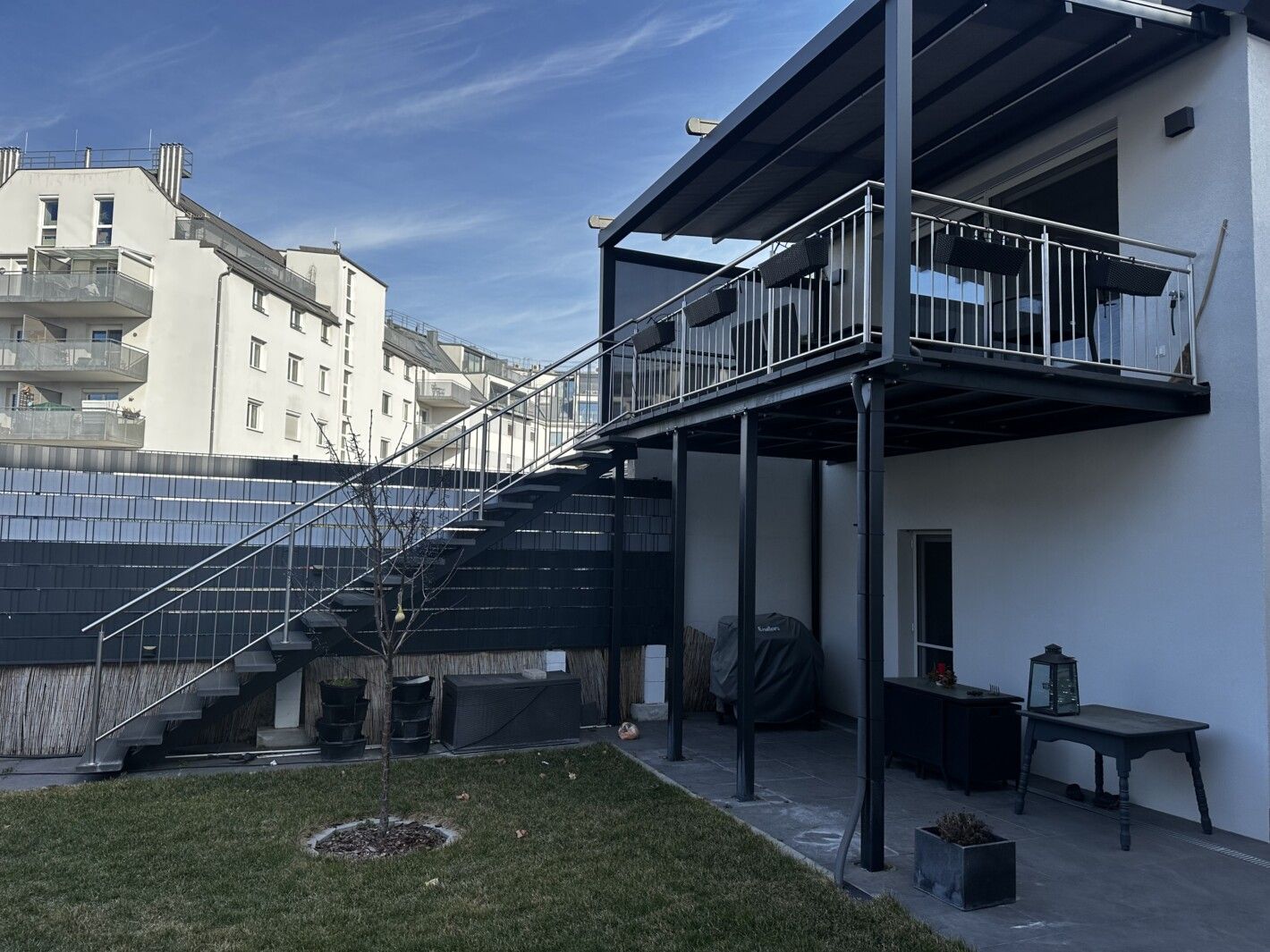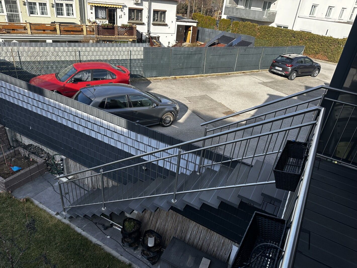 Mittelholmtreppe mit Bauzugelassenem Glasfaserverstärktem Kunststoff Trittstufen belegt, Edelstahl Stabgeländer voll verschweißt, Terrasse Stahl pulverbeschichtet, auf Stahlsteher gestellt, Terrassenbelag ist glasfaserverstärkter Kunststoff