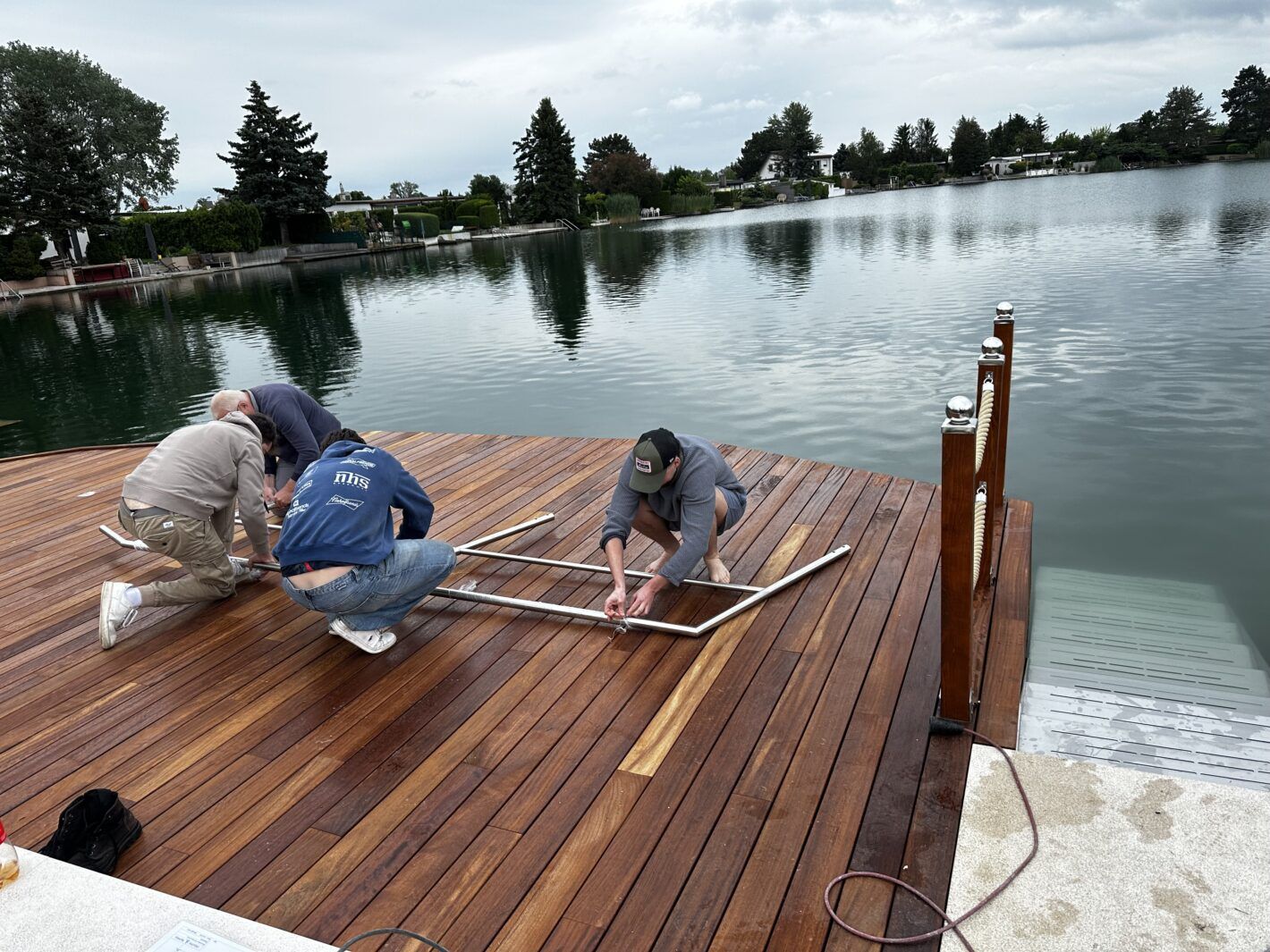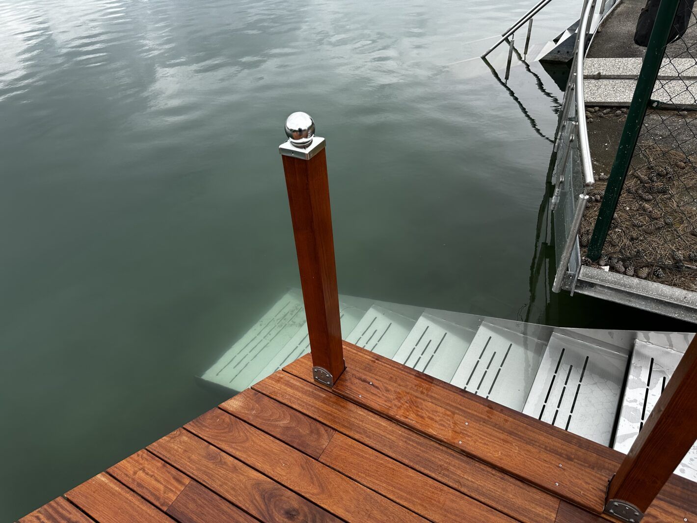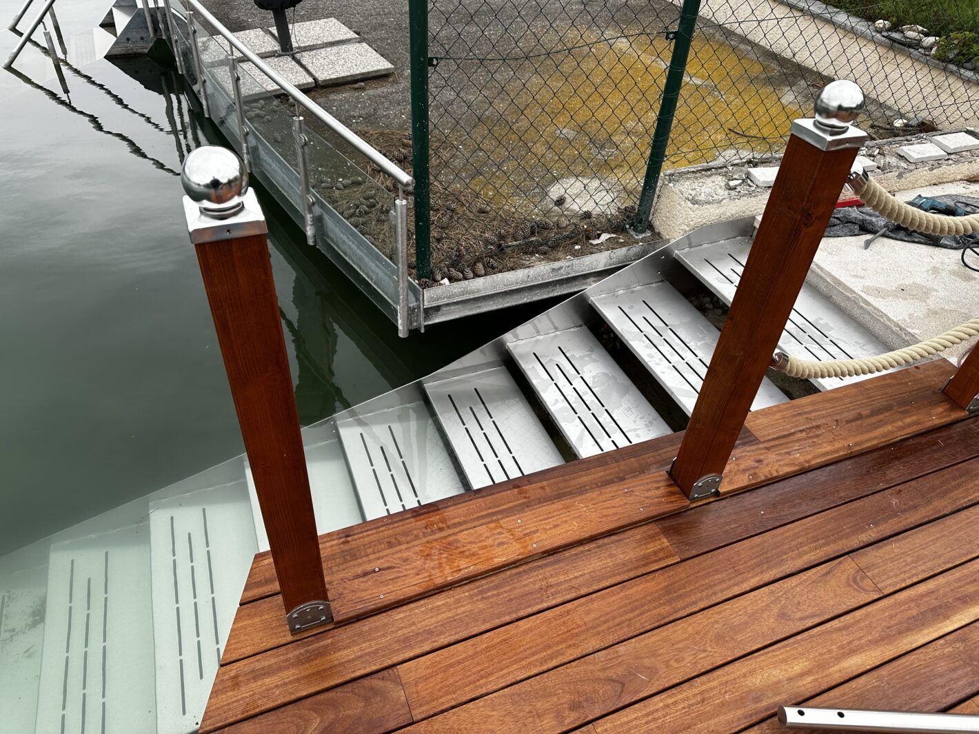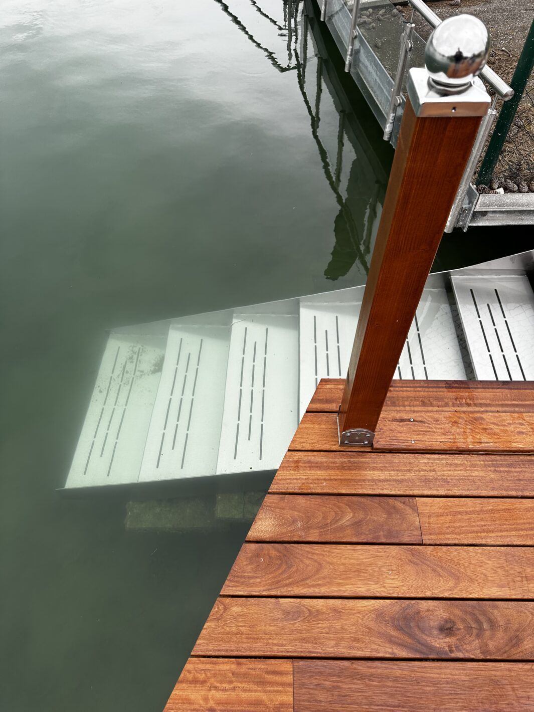 Seetreppe mit Edelstahlwangen, Trittstufen mit Anti-Rutschstreifen gelasert, Geländer folgt