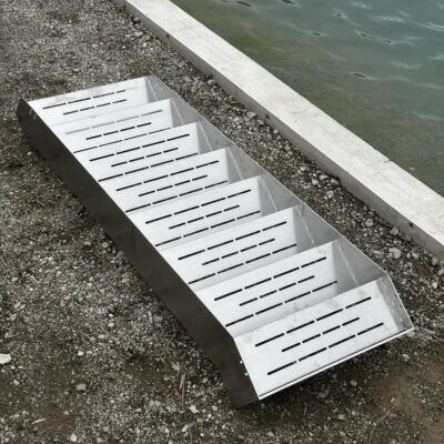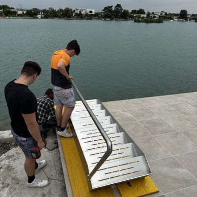 Seetreppe mit Edelstahlwangen, Trittstufen mit Anti-Rutschstreifen gelasert, Edelstahlgeländer