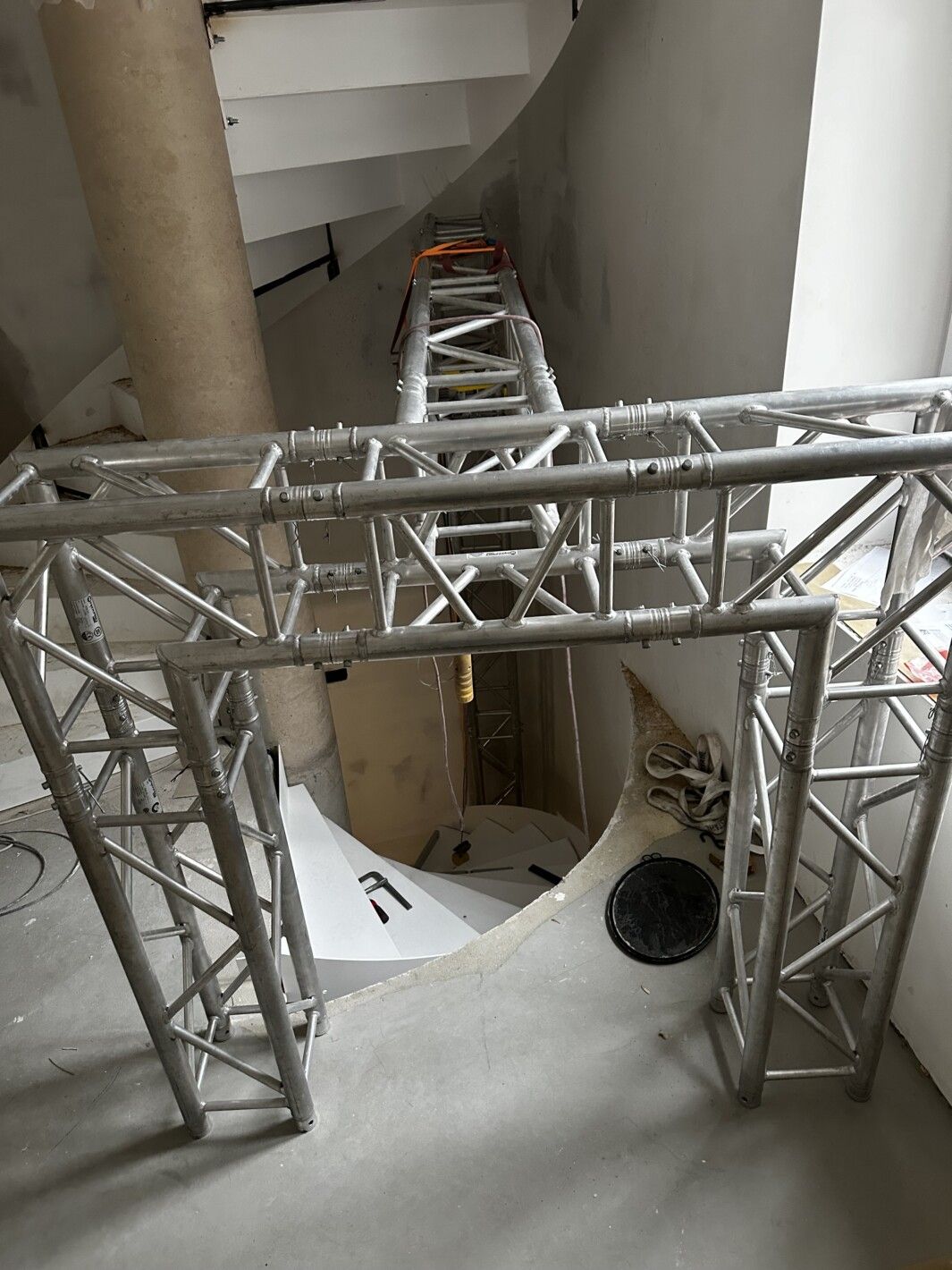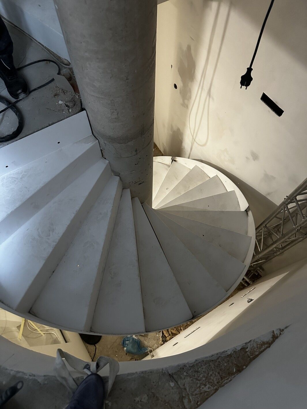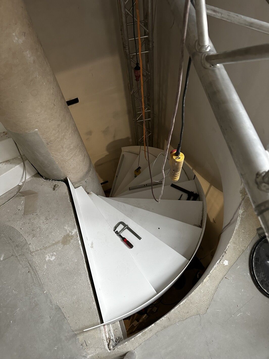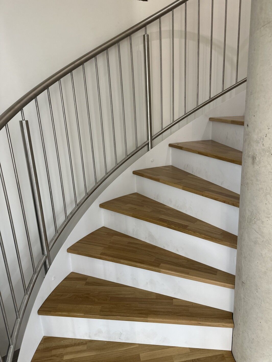 Tritt- und Setzstufen aus Stahl gelasert und in der Werkstatt teilverschweißt. weiß pulverbeschichtet, nach Montage mit Eichentrittstufen belegt, Edelstahl Stabgeländer kindersicher