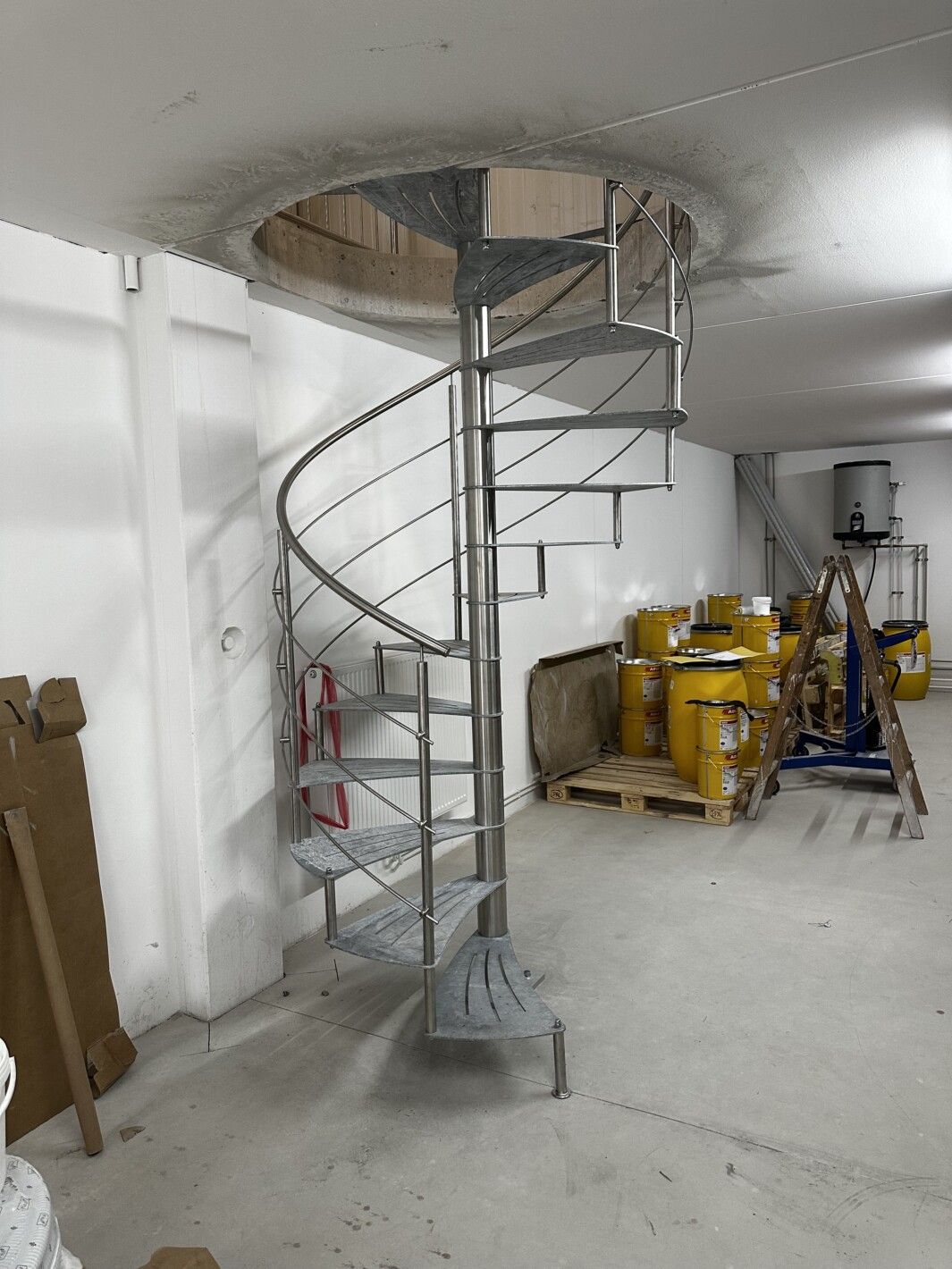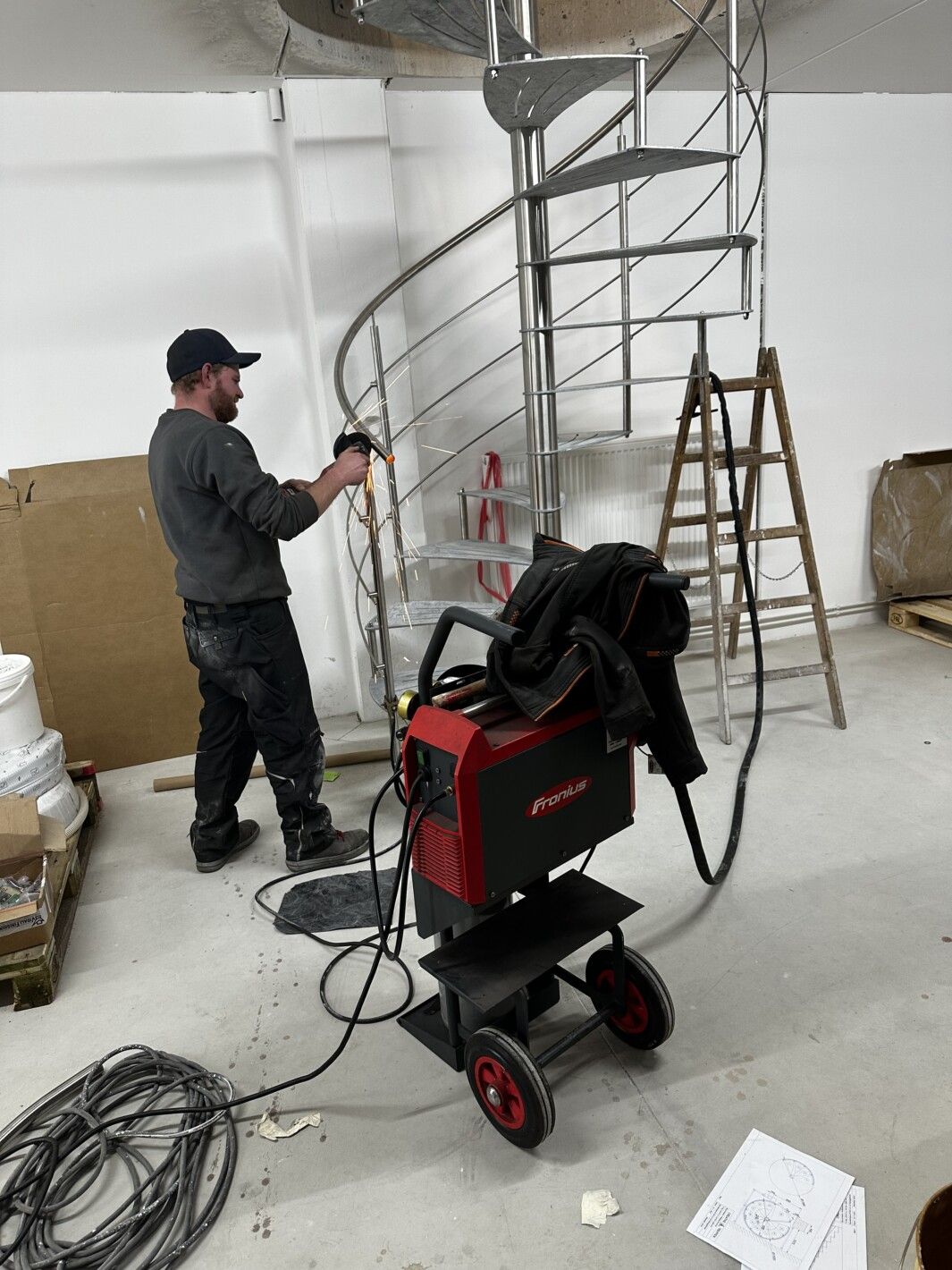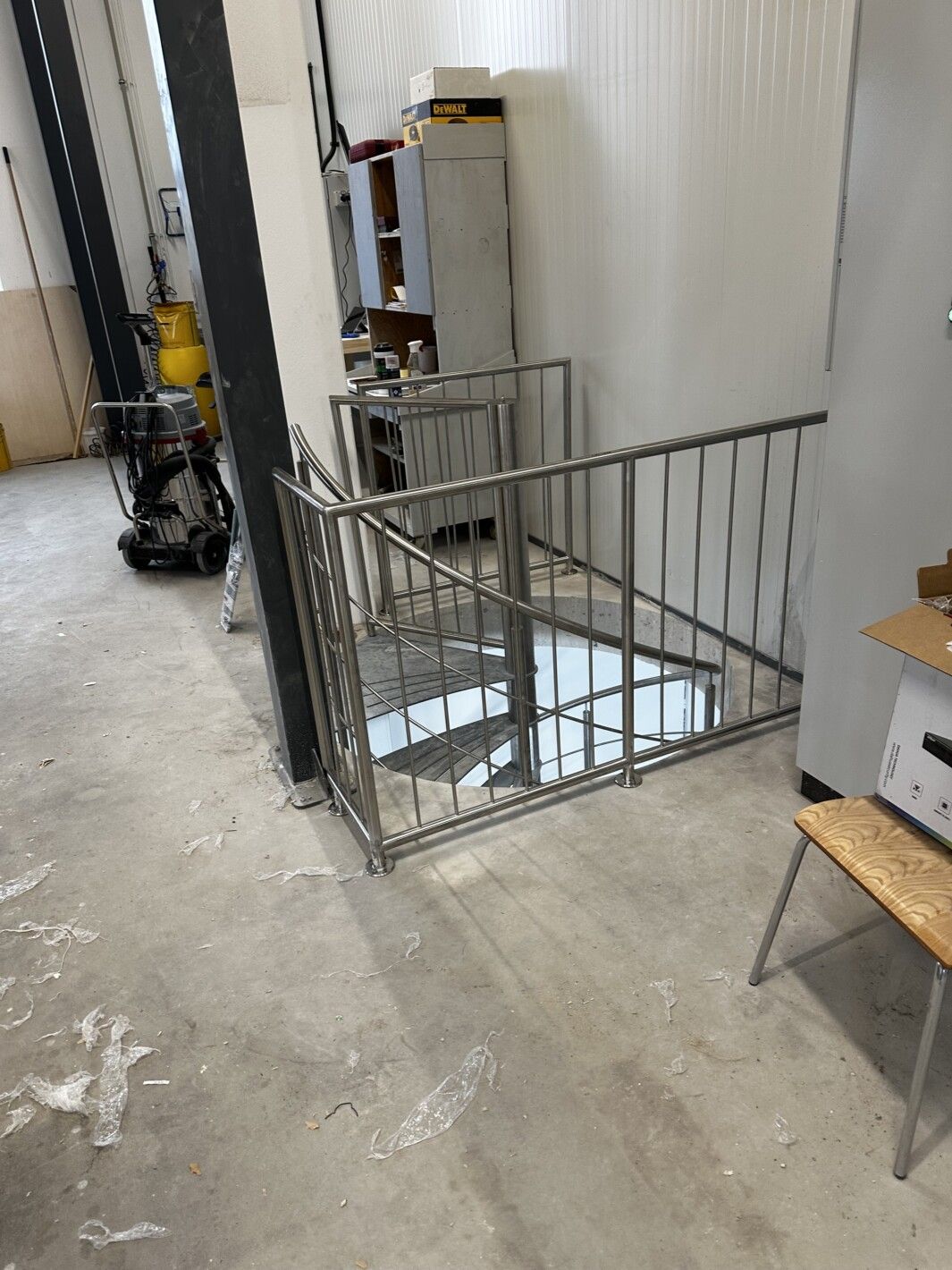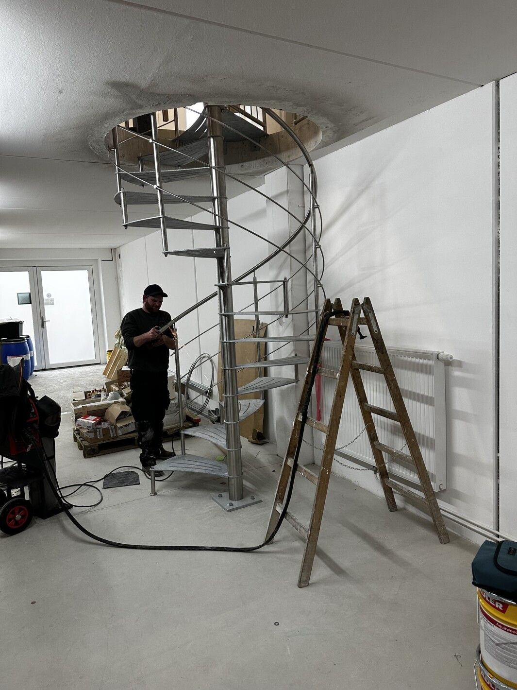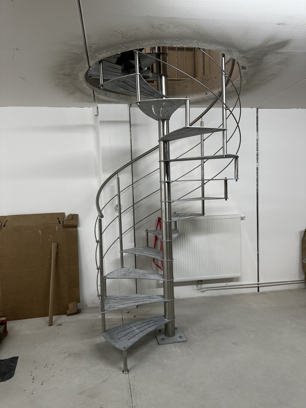 Trittstufen aus Stahl mit Anti-Rutschstreifen gelasert, feuerverzinkt. Spindelhülsen Stufenbolzen, Geländer aus Edelstahl gefertigt, Brüstungsgeländer Edelstahl vollverschweißt