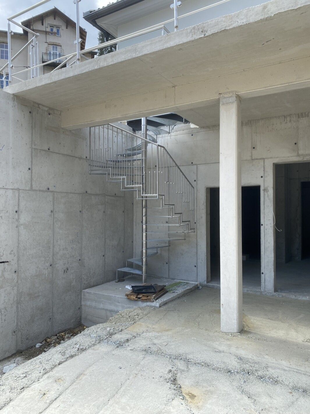 Spindeltreppe Linz, Spindel Edelstahl, Stufenbolzen Edelstahl, Geländer Edelstahl vollverschweißt, Trittstufen Stahl feuerverzinkt