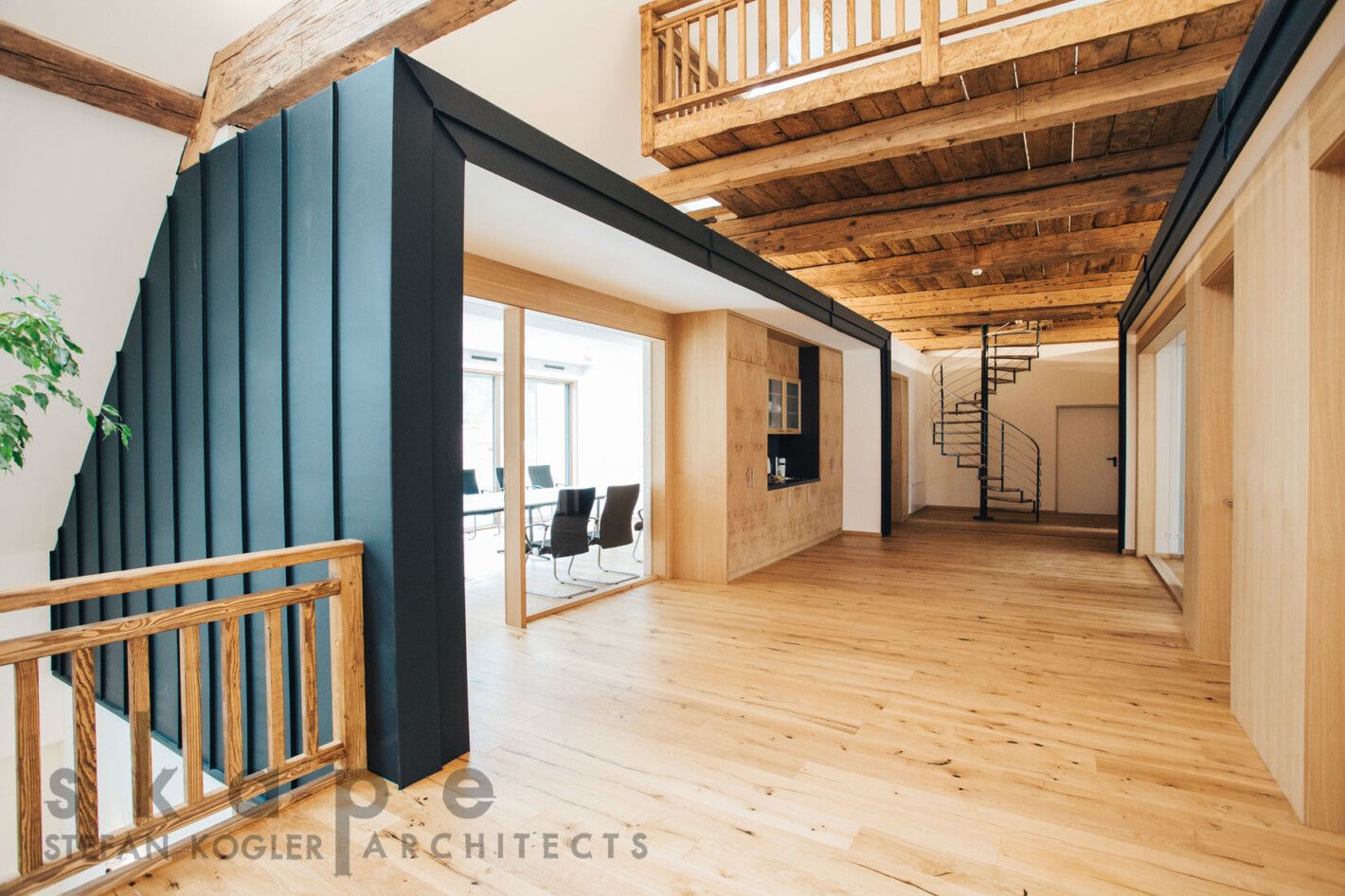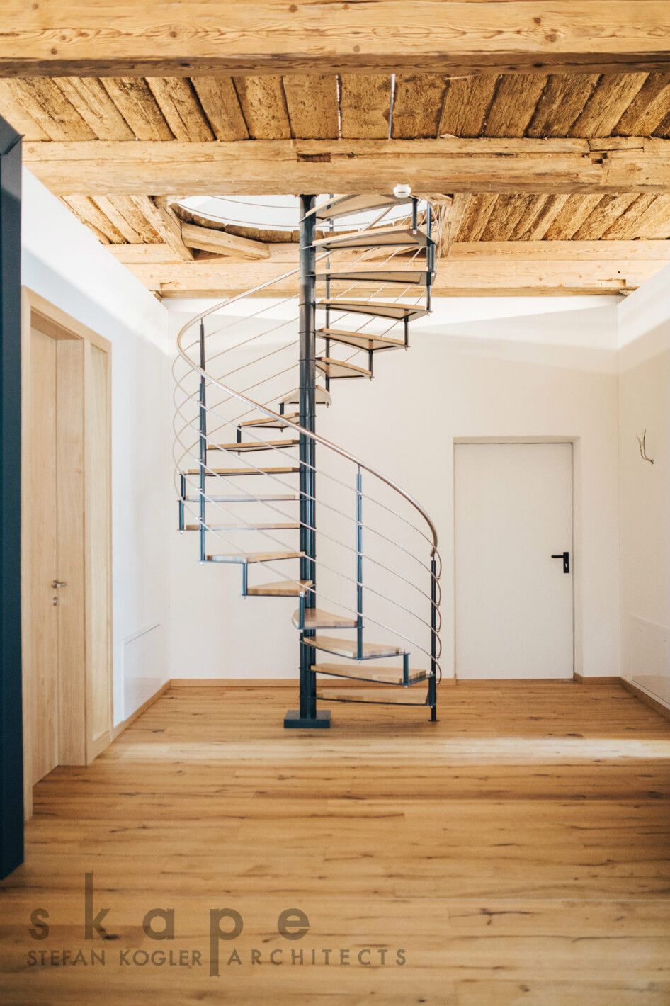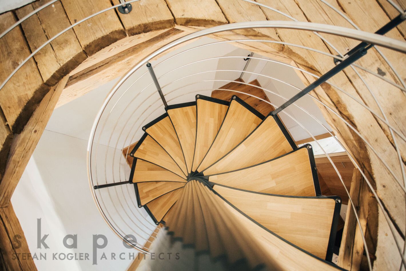 Spindeltreppe Vienna teilweise pulverbeschichtet, Edelstahl Trittstufen gelasert mit Eiche Massivholztrittstufen belegt, Edelstahl Relinggeländer, in der Brauerei Hirter Bier