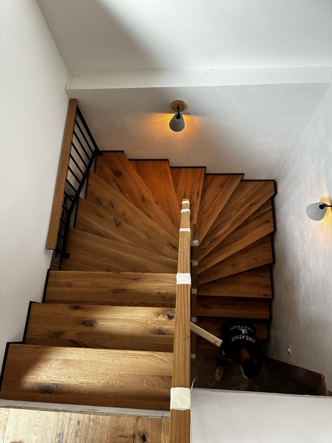 Stahlwangentreppe abgetreppt Matt Schwarz pulverbeschichtet, 1/2 gewendelt, Trittstufen Eiche massiv rustikal, Edelstahl Stabgeländer matt schwarz pulverbeschichtet mit Eichenhandlauf