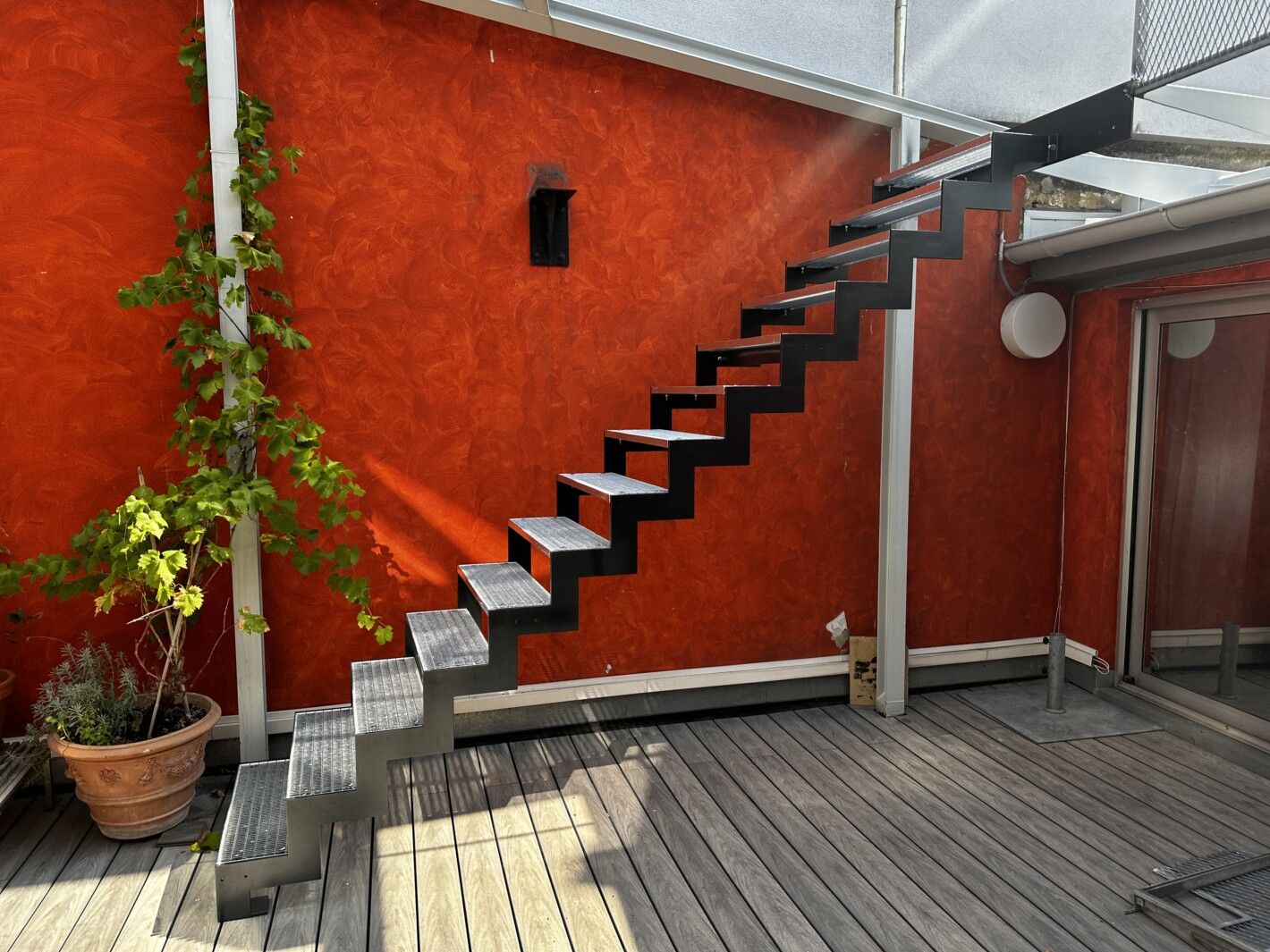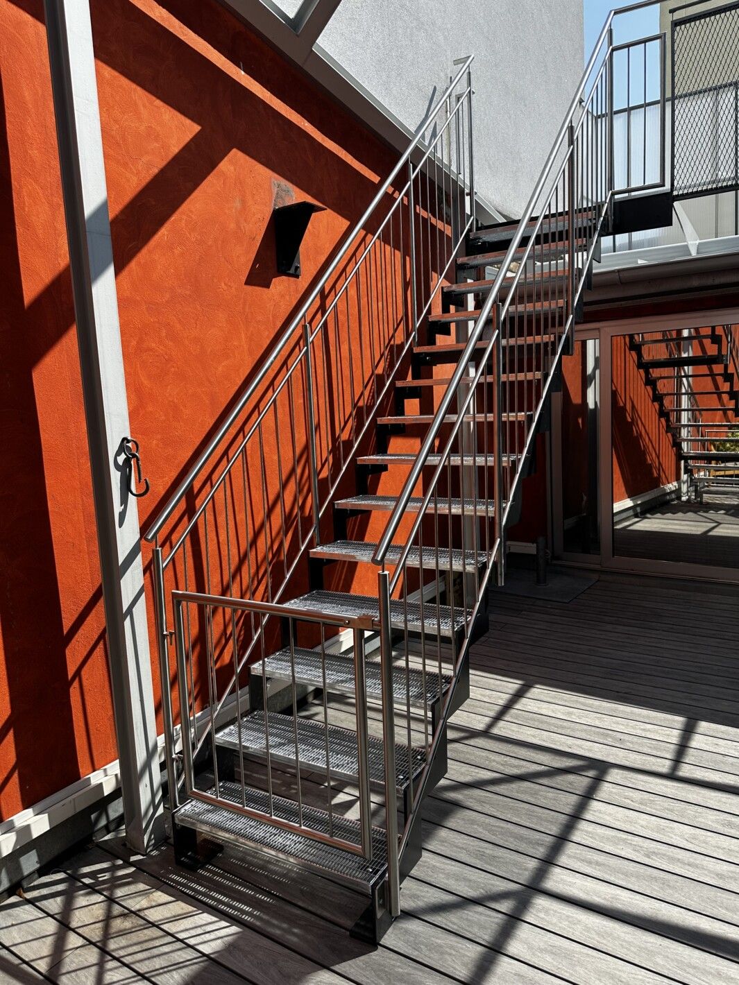 Stahlwangentreppe abgetreppt mit Gitterrosttrittstufen schwarz pulverbschichtet Gitterrost engmaschig, Edelstahlstabgeländer beidseitig voll verschweißt, Edelstahltüre als Kindersicherung