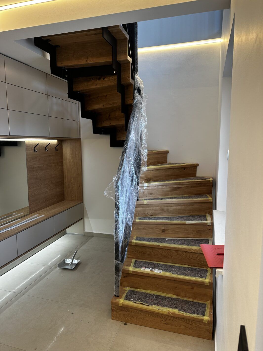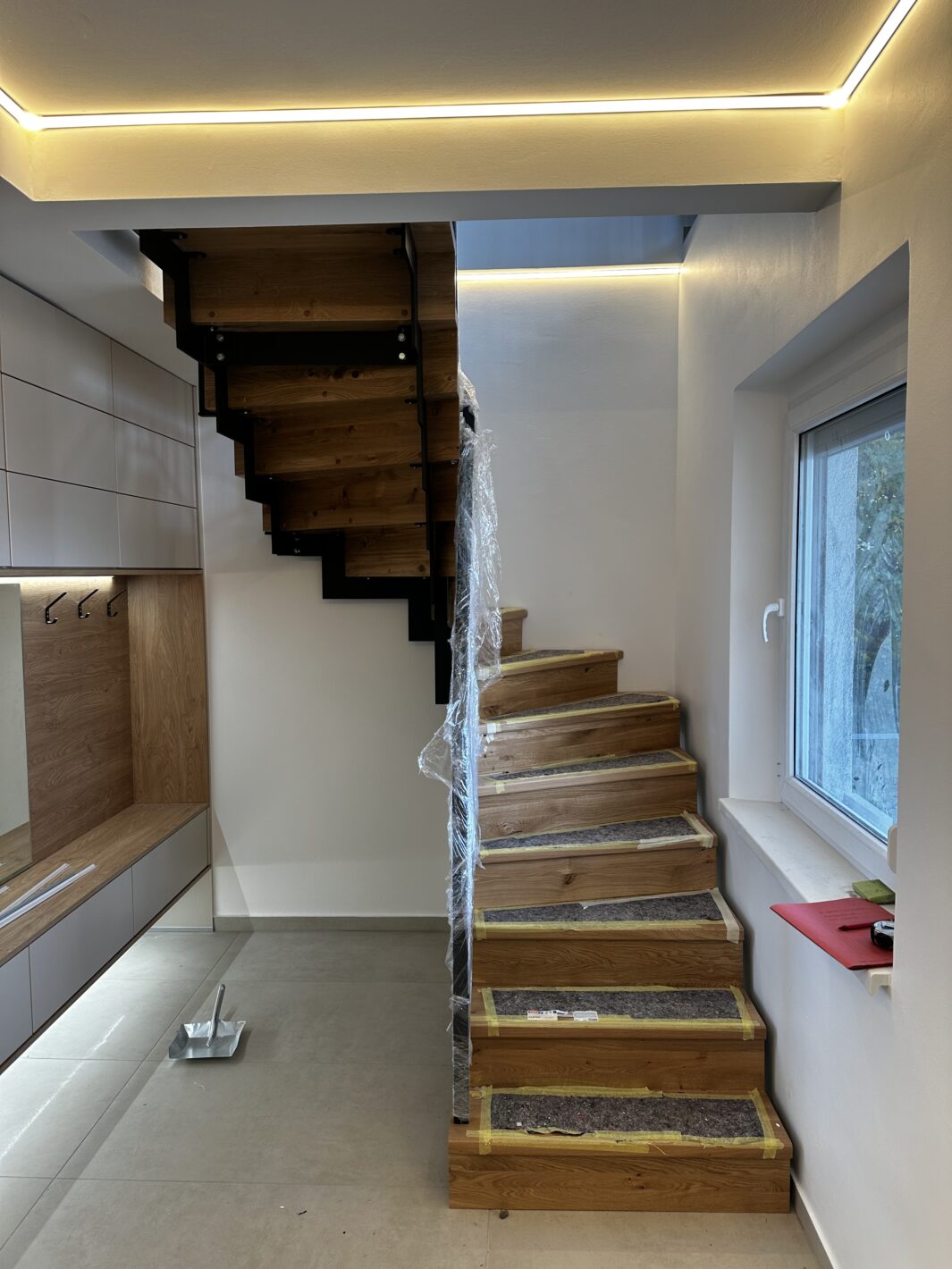 Stahlwangentreppe nach RAL pulverbeschichtet, Eiche massiv Tritt- und Setzstufen in Faltwerkoptik, Fotos folgen