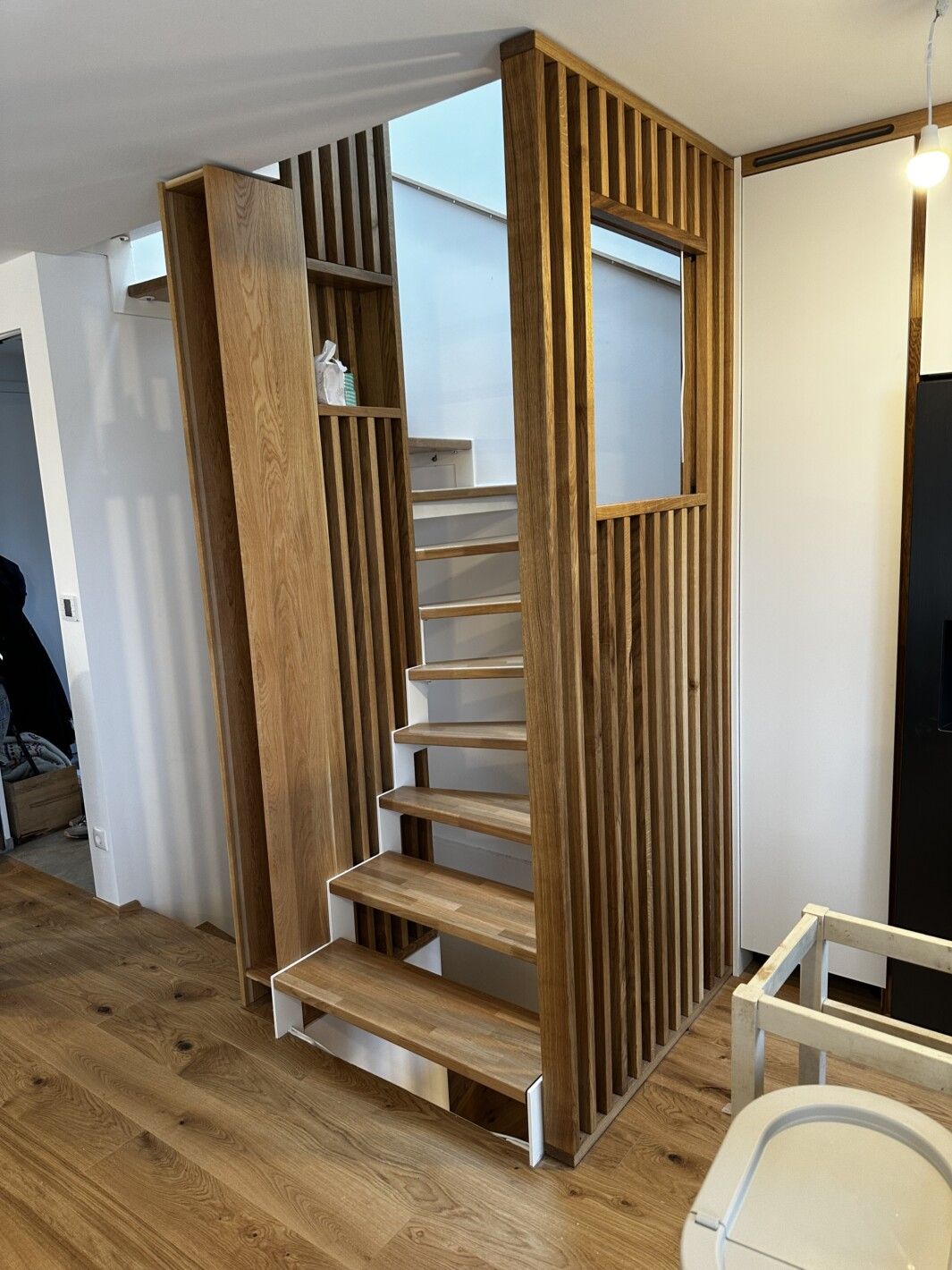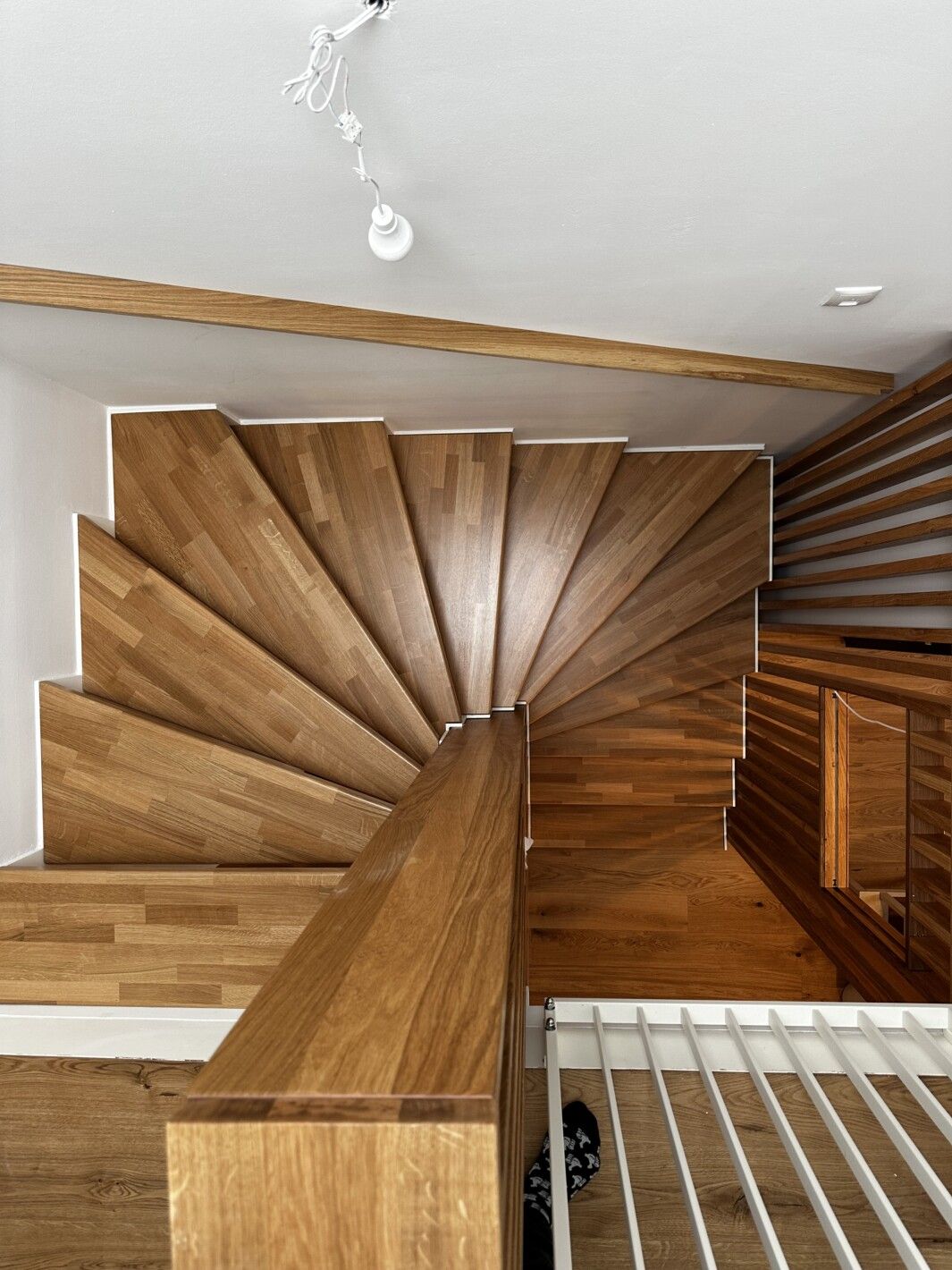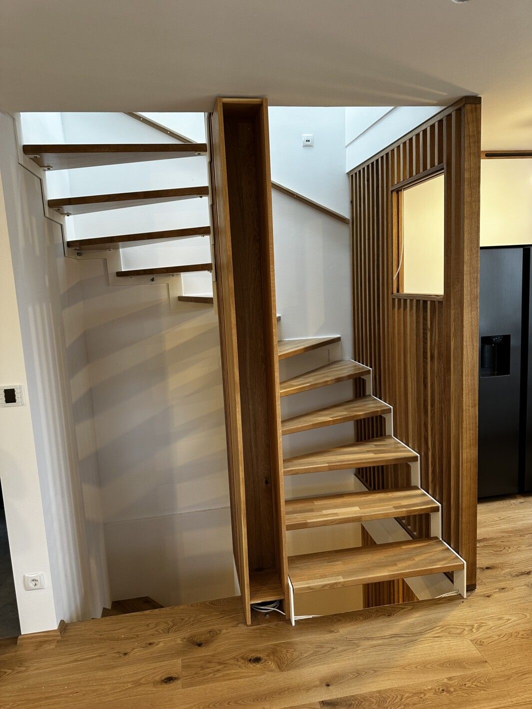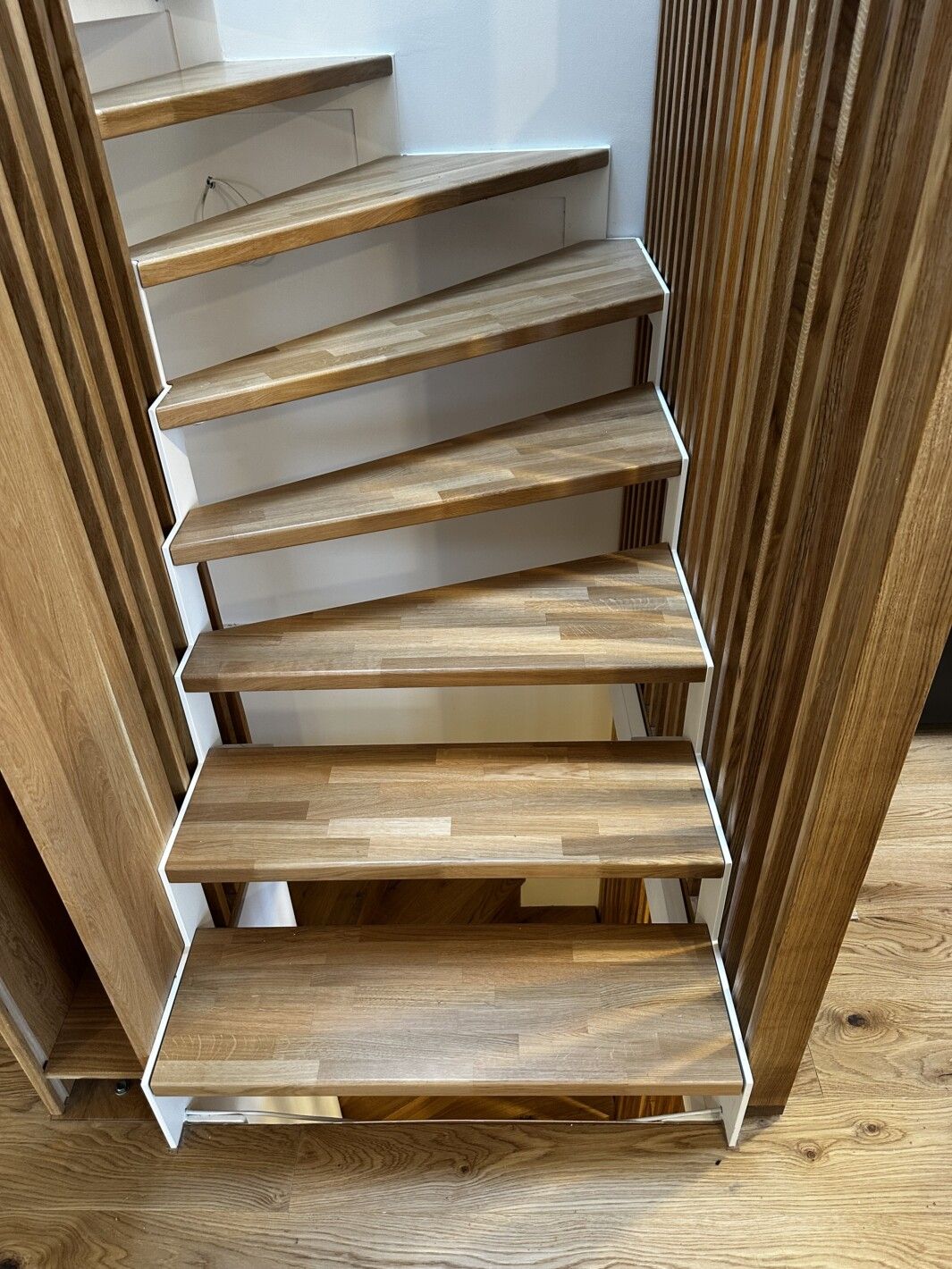 Stahlwangentreppe nach RAL weiß pulverbeschichtet, Trittstufen Eiche massiv teilgezinkt, Absturzsicherung wurde aus massiver Eiche nach Maß gefertigt