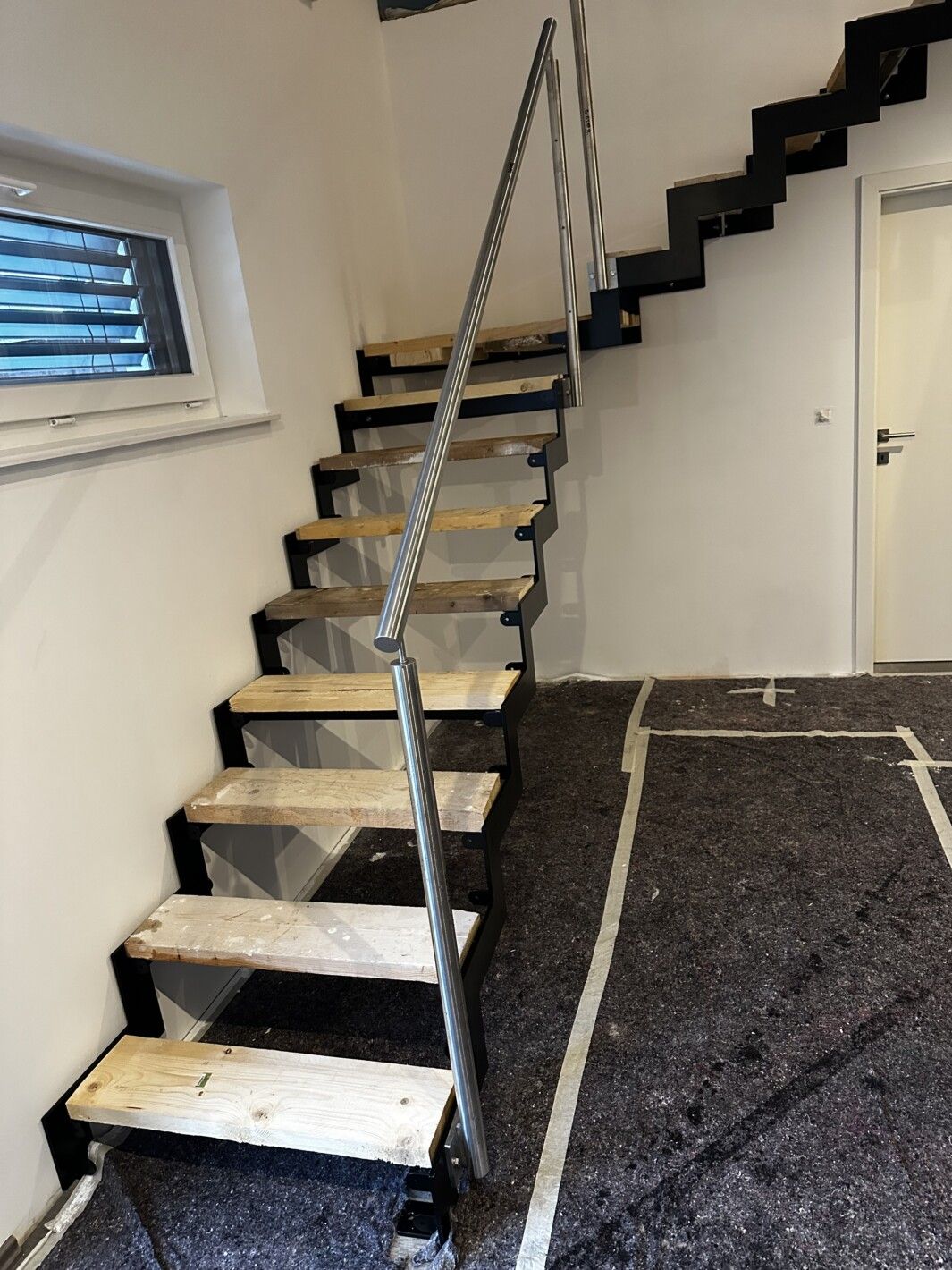 schwarz pulverbeschichtet, mit Bautrittstufen belegt. wird während des Baustadiums als Bautreppe verwendet, nach Abschluss der Bautätigkeit werden die Bautrittstufen auf die aktuellen Holztrittstufen getauscht