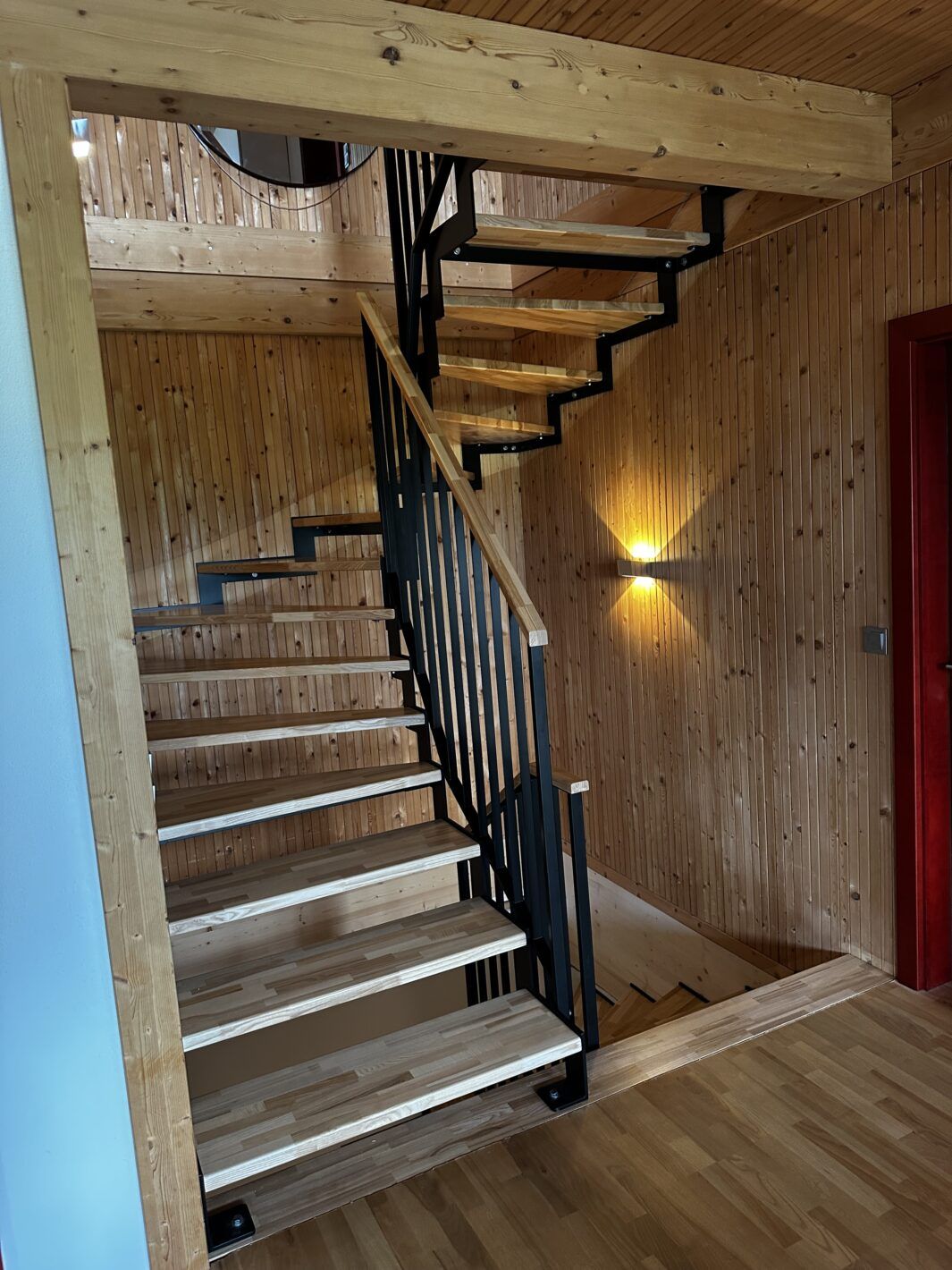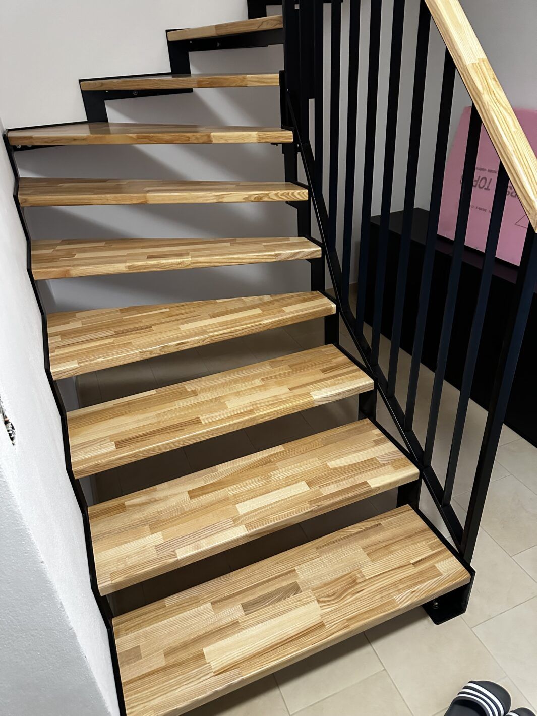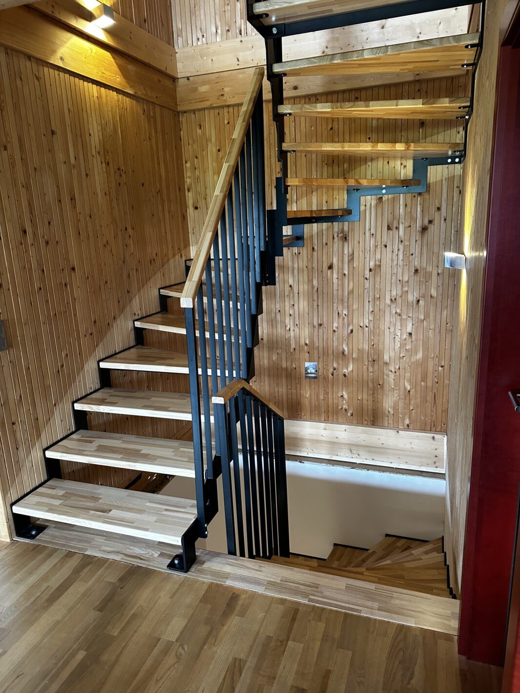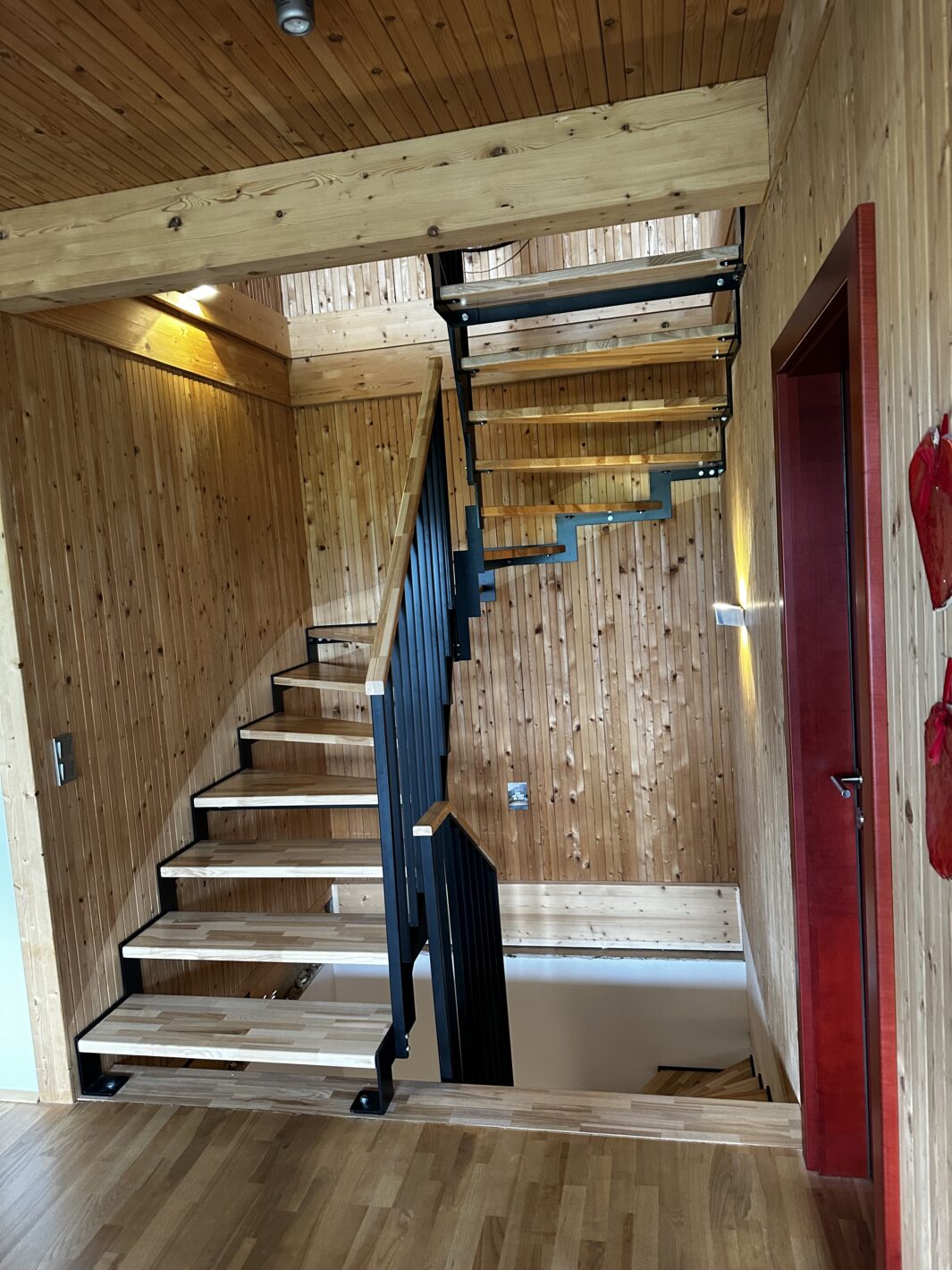 Stahlwangentreppe schwarz pulverbeschichtet, Stufen Eiche massiv, zwischen den Stahlwangen befestigt, Edelstahl Stabgeländer schwarz pulverbeschichtet.