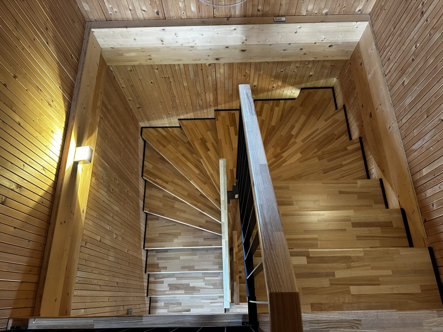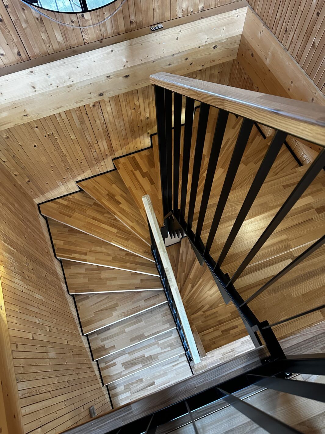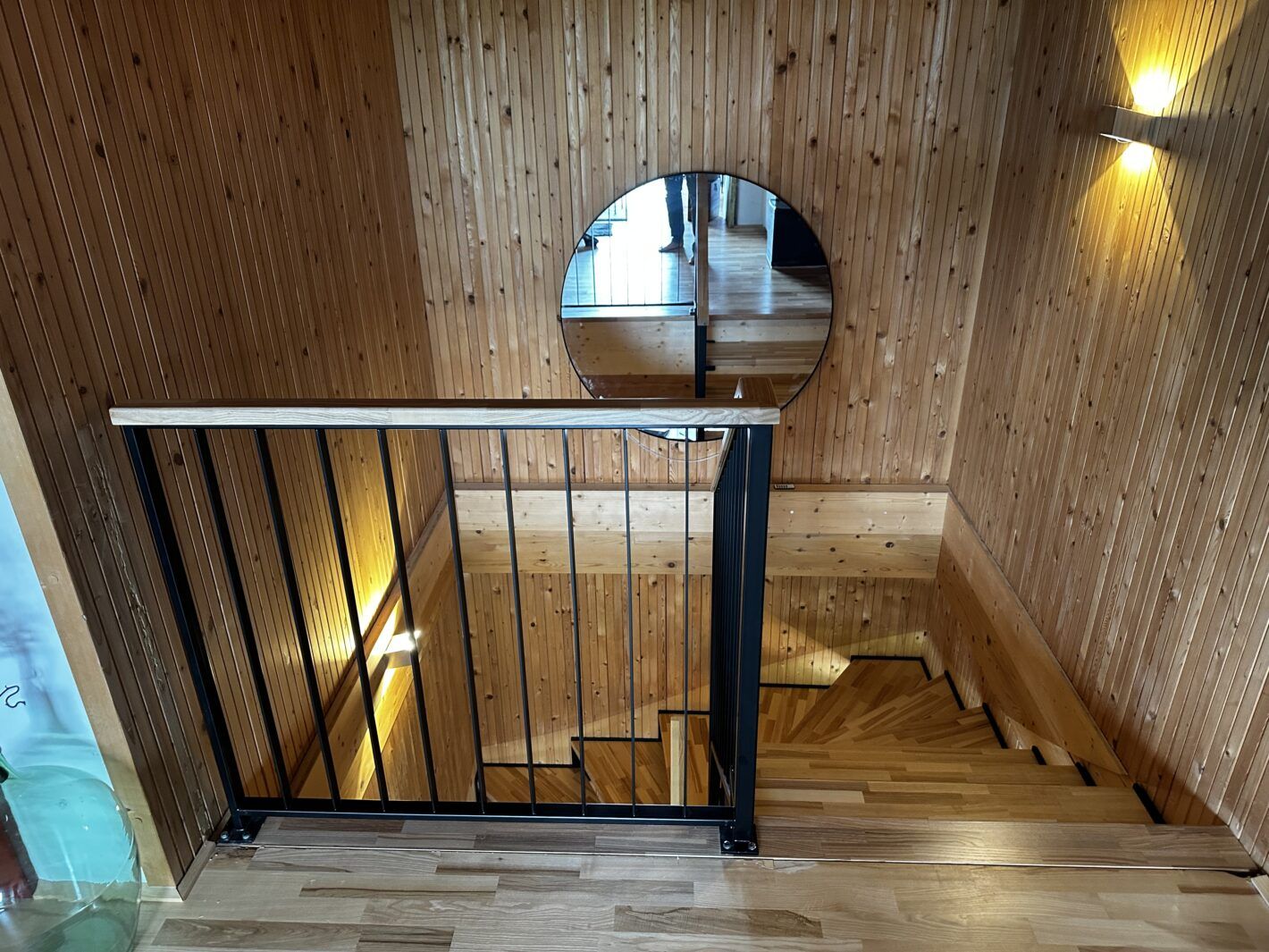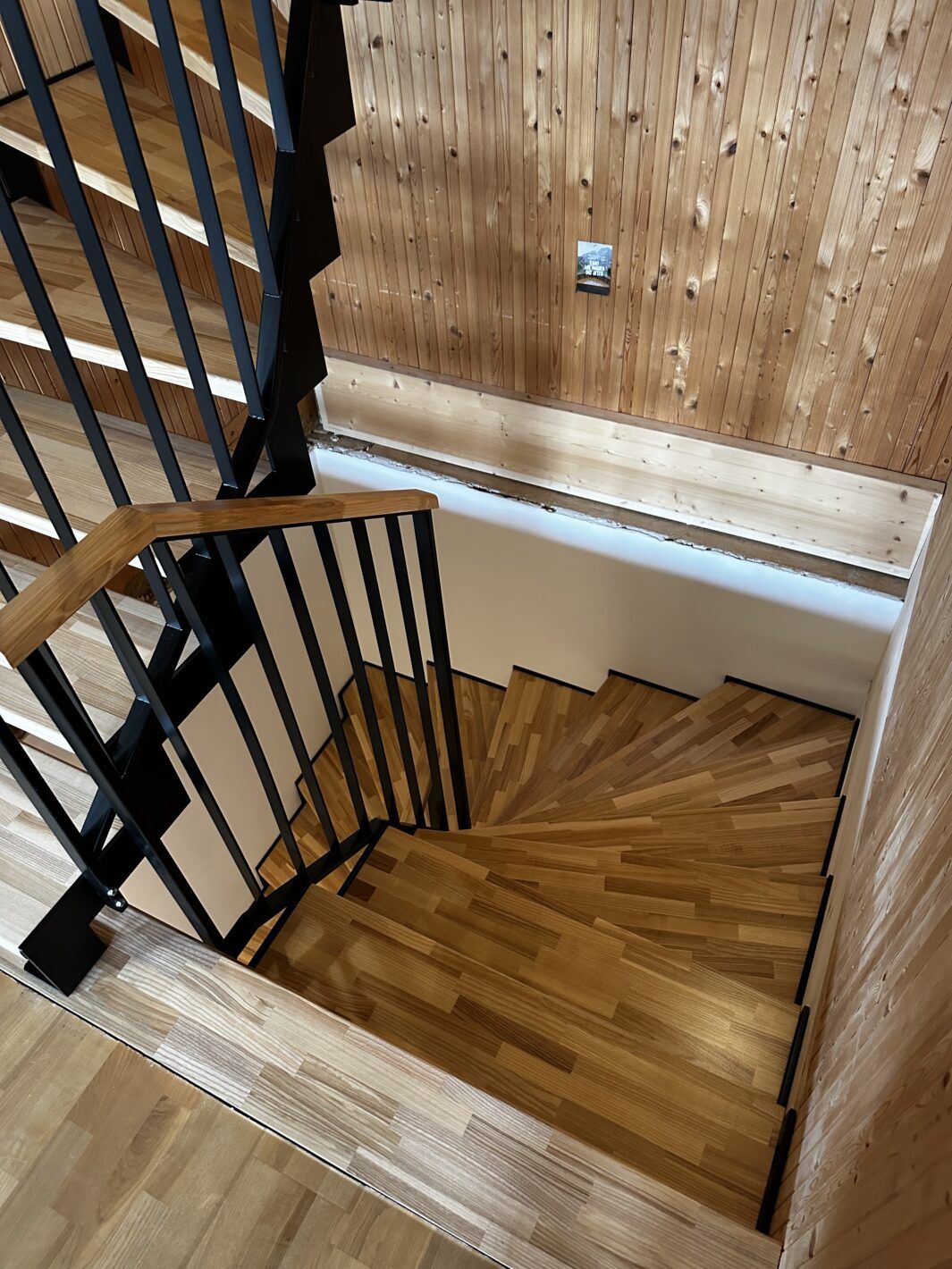 Stahlwangentreppe schwarz pulverbeschichtet, Stufen Eiche massiv, zwischen den Stahlwangen befestigt, Edelstahl Stabgeländer schwarz pulverbeschichtet.