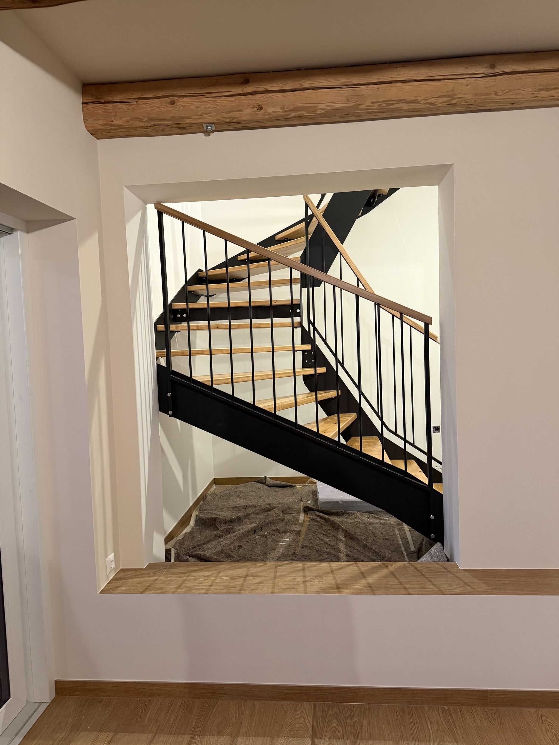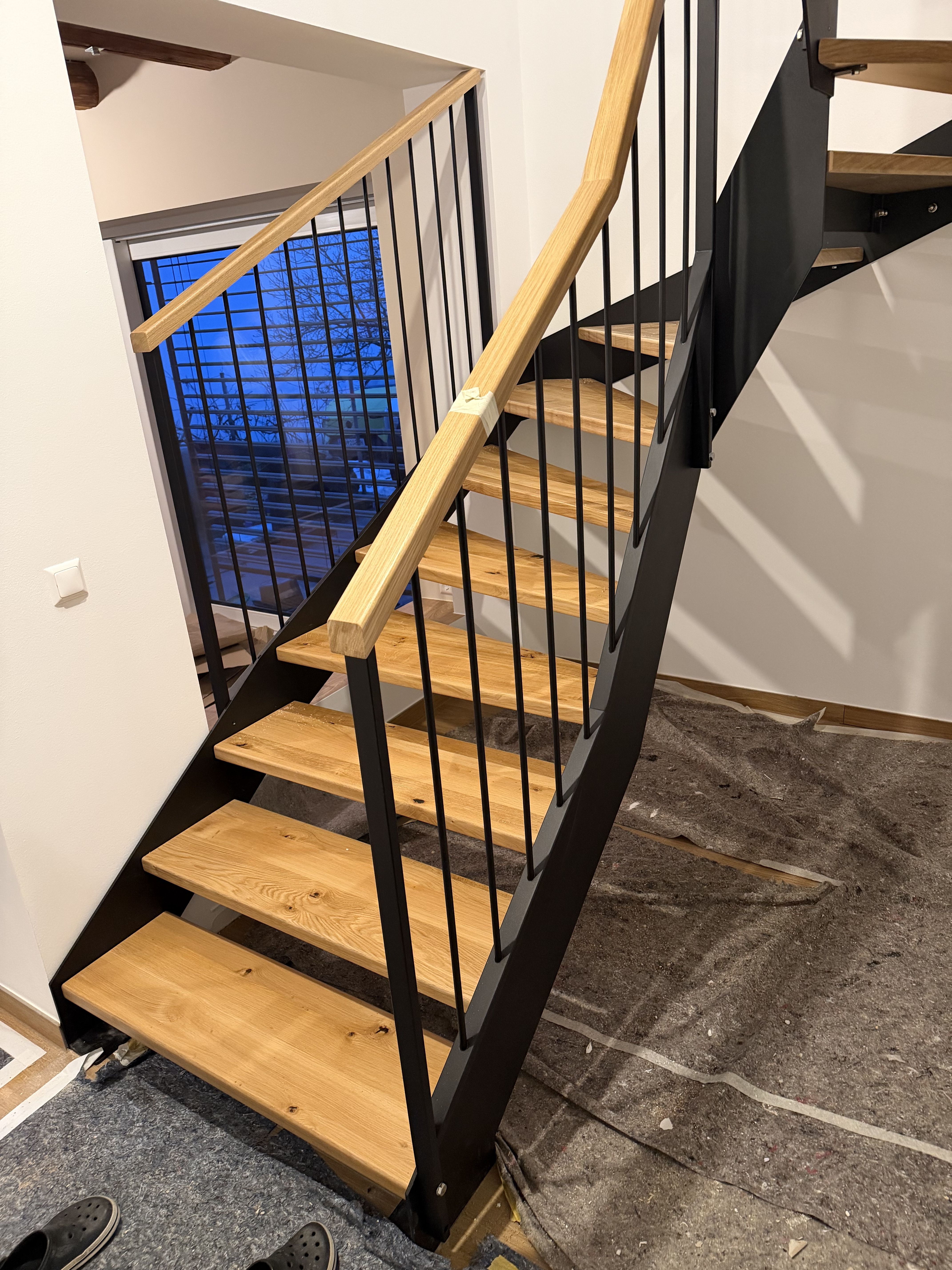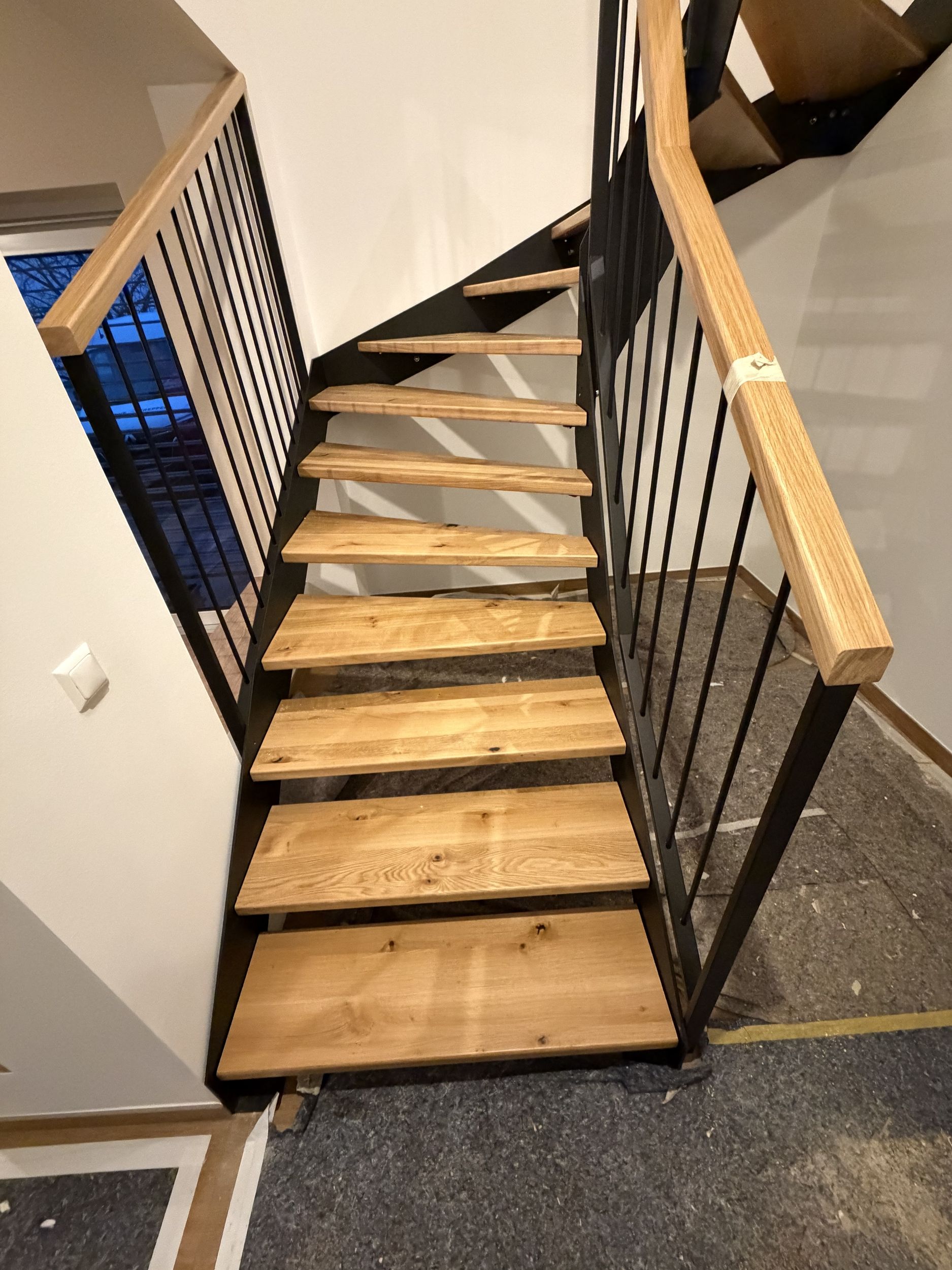 Stahlwangentreppe nach RAL schwarz pulverbeschichtet, Trittstufen Eiche rustikal, Edelstahl Stabgeländer schwarz pulverbeschichtet
