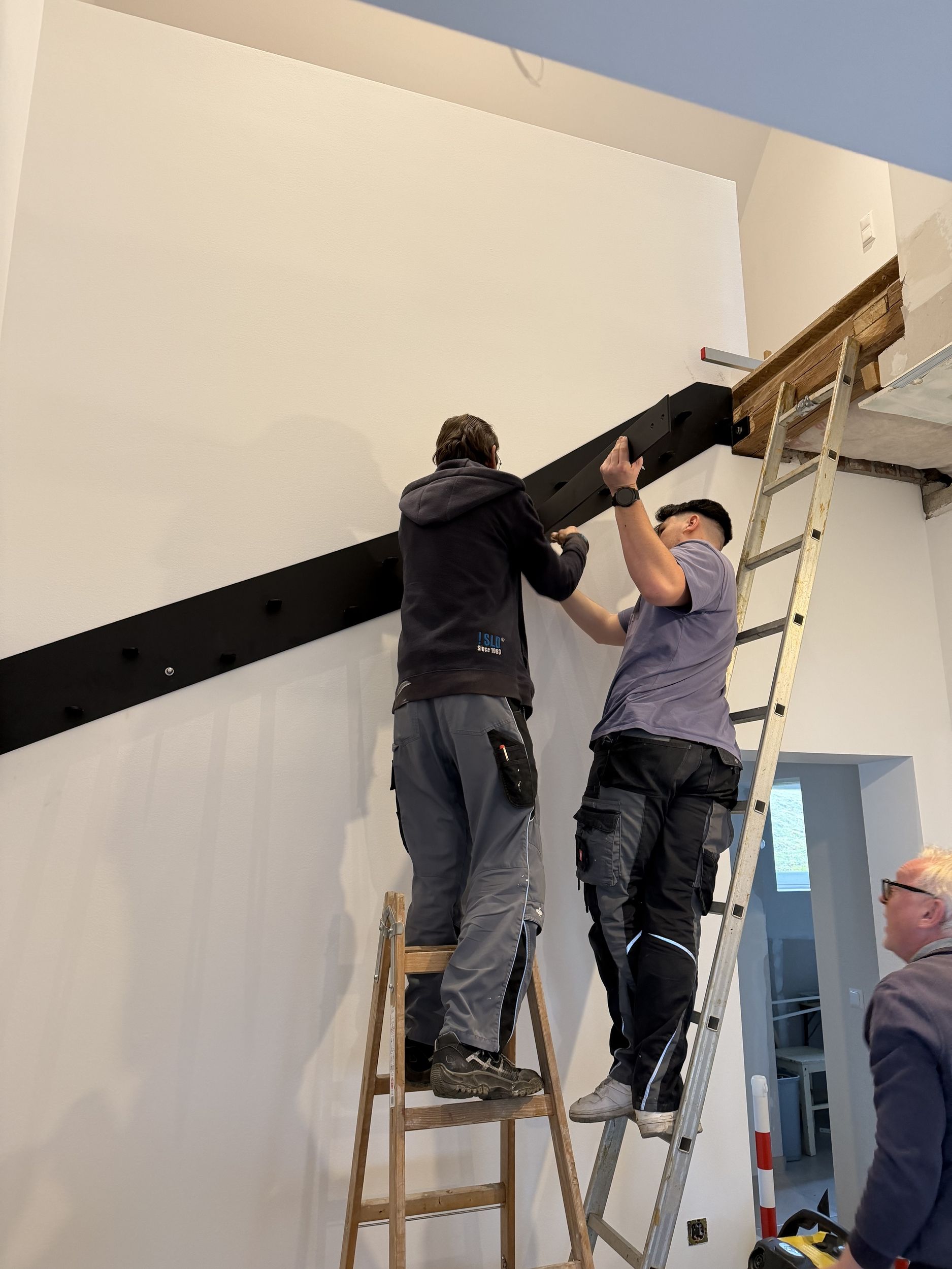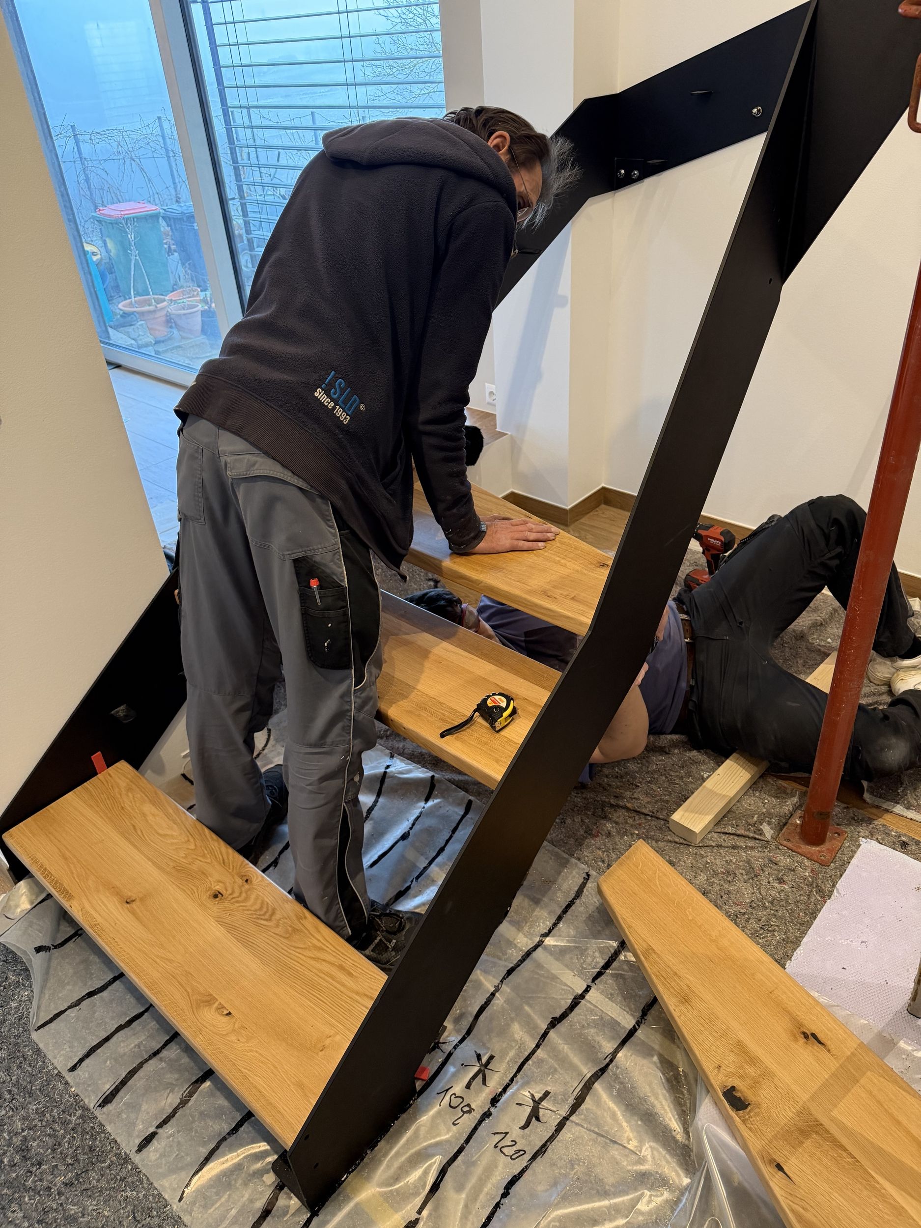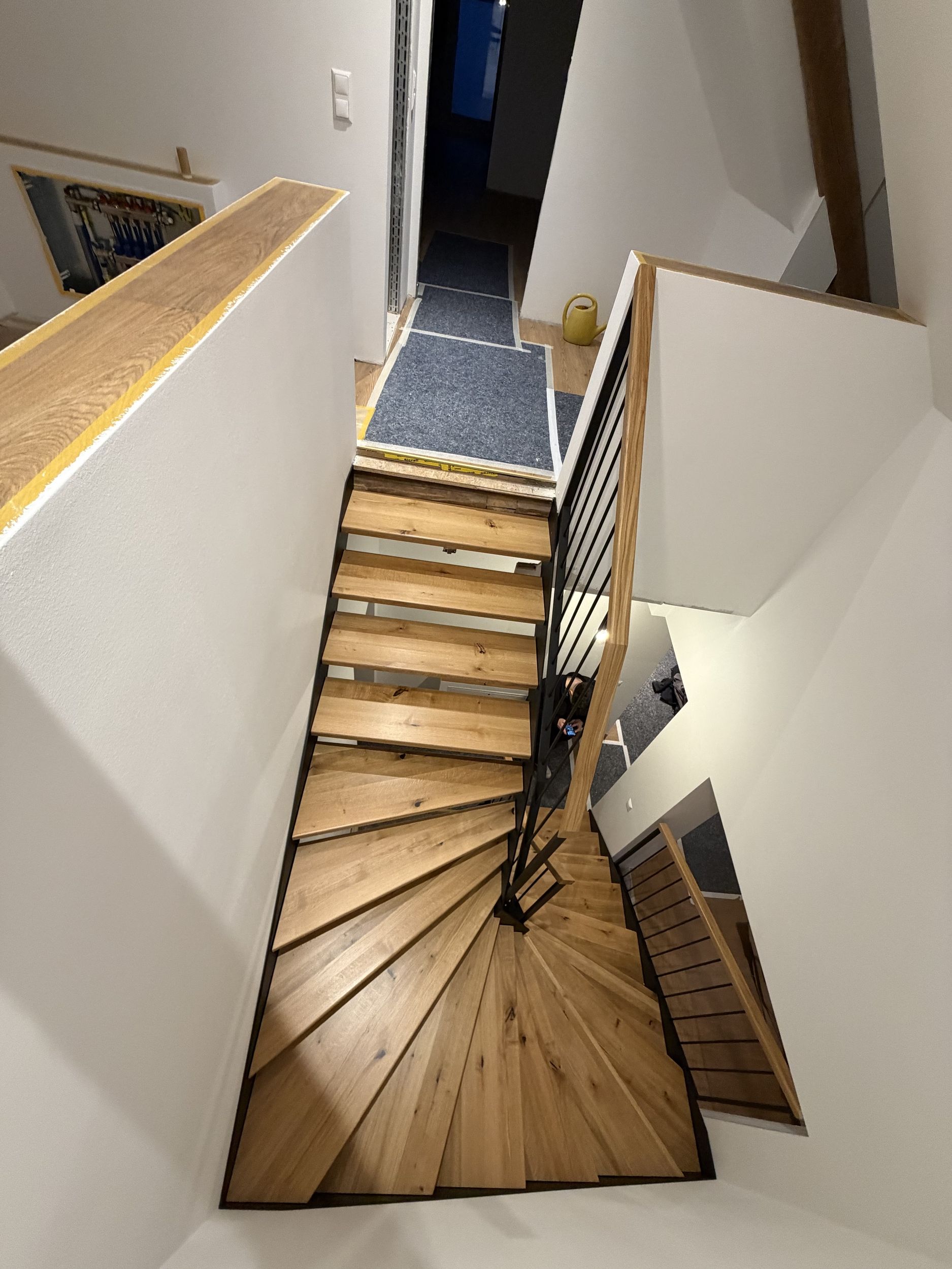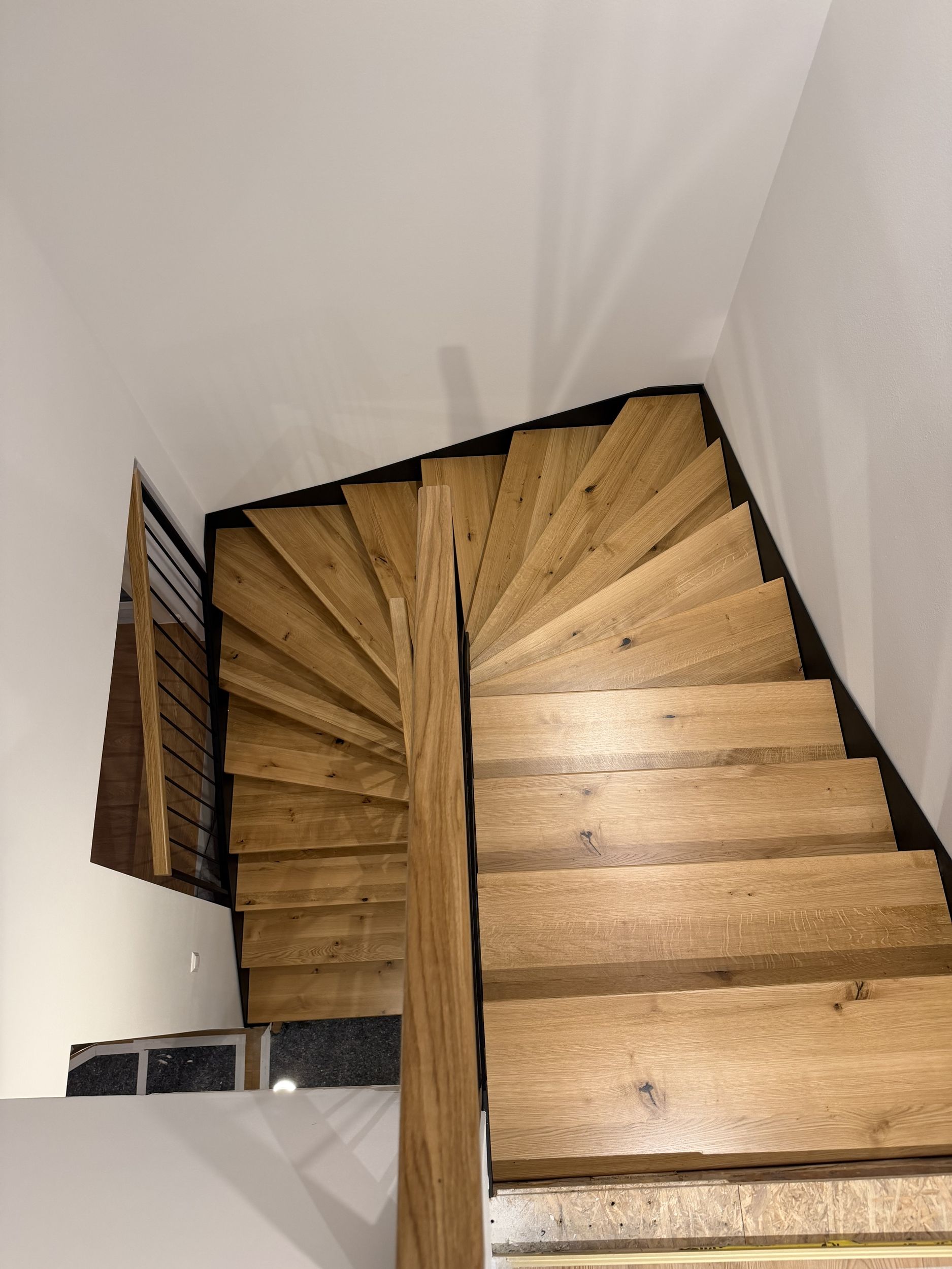 Stahlwangentreppe nach RAL schwarz pulverbeschichtet, Trittstufen Eiche rustikal, Edelstahl Stabgeländer schwarz pulverbeschichtet