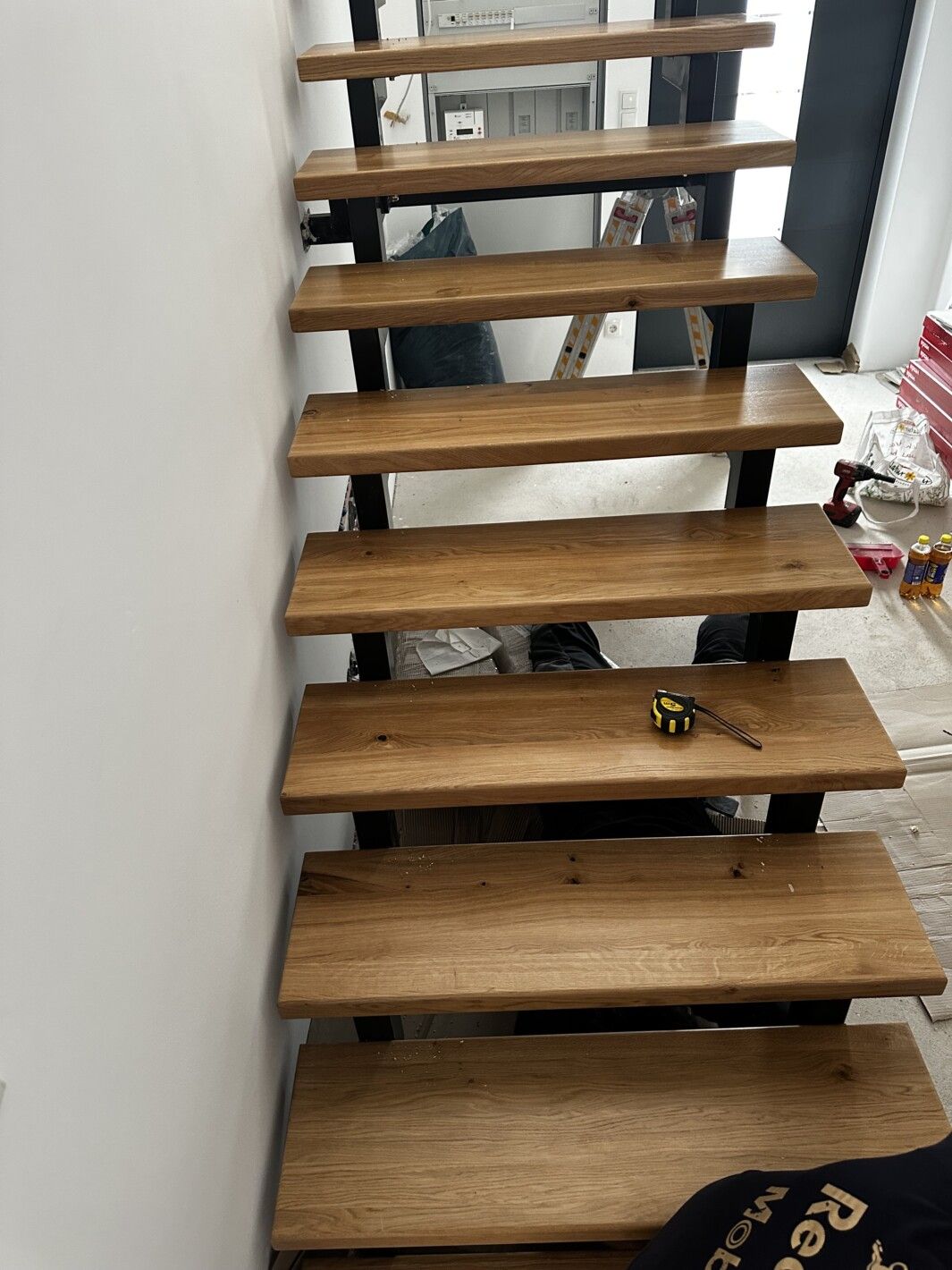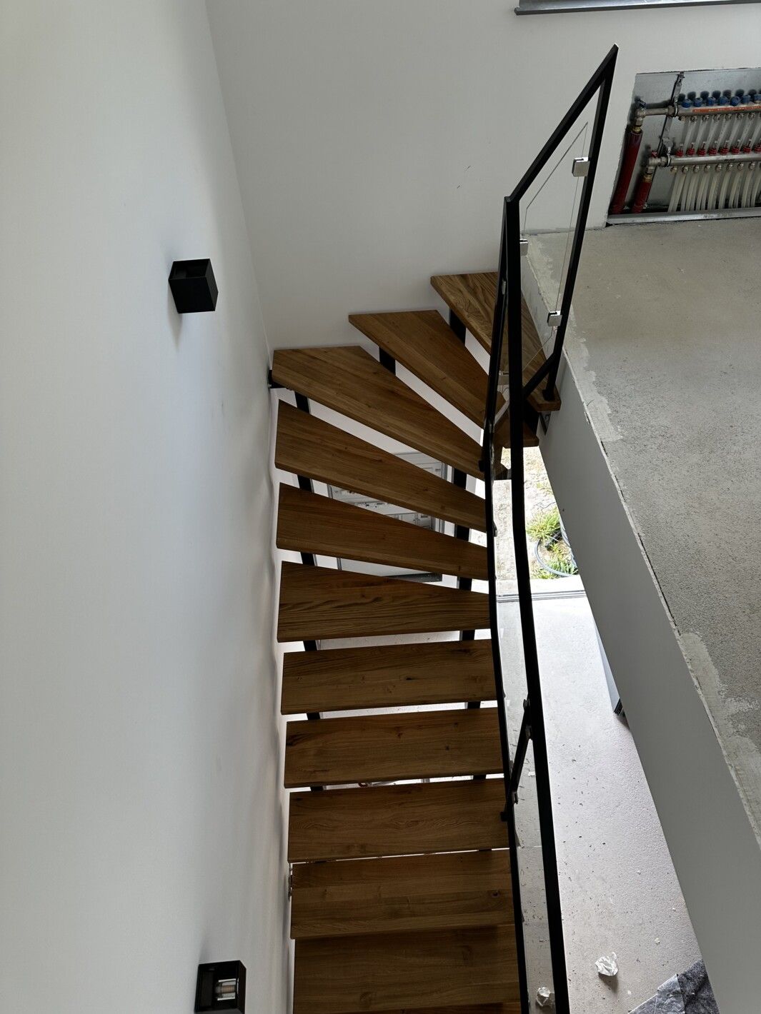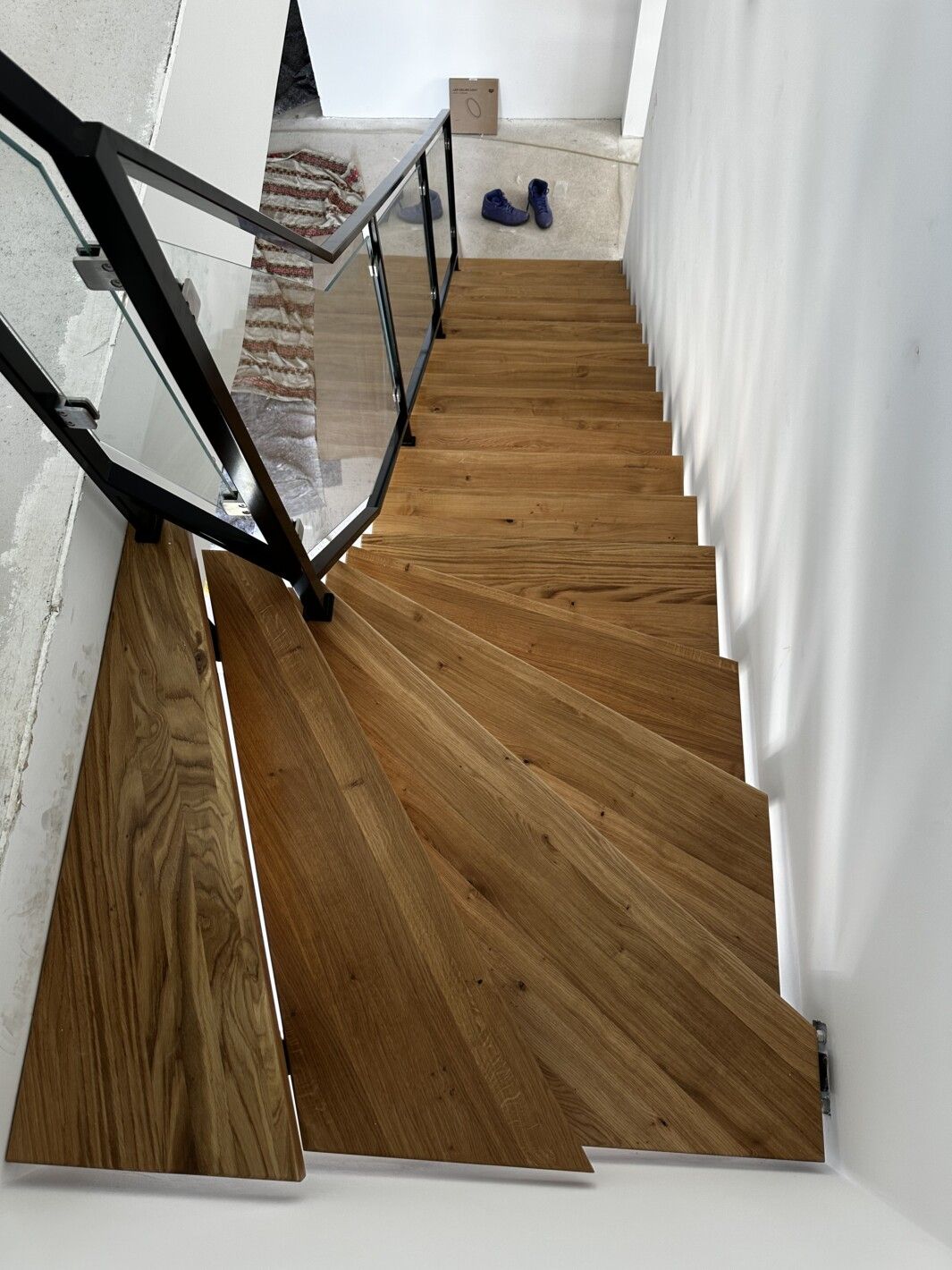 Trittstufen Eiche rustikal 50mm Edelstahl Glasgeländer VSG TVG Schwarz pulverbeschichtet