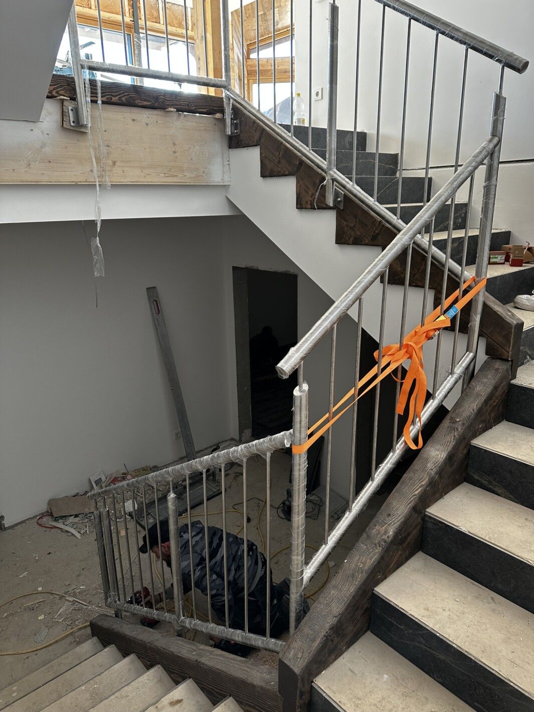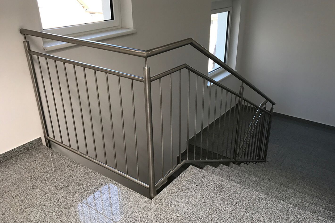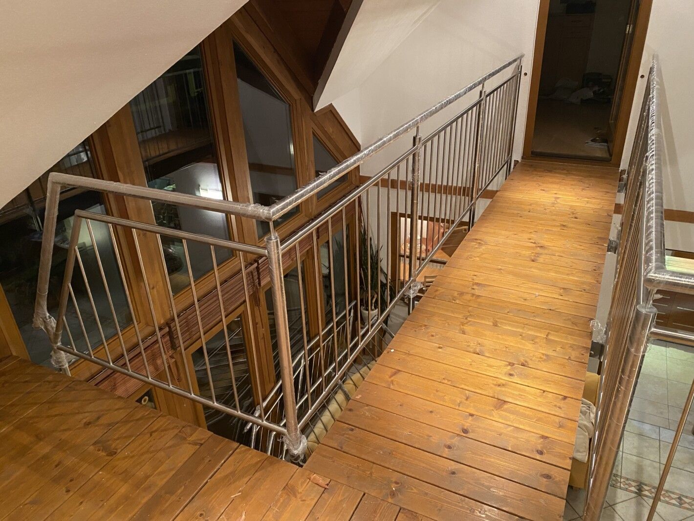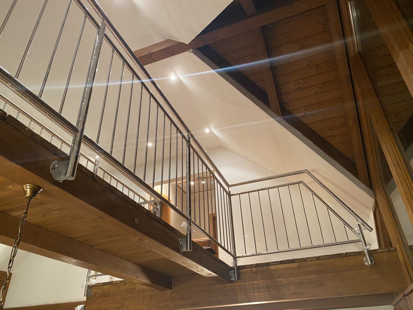 Sicherheit und Formschönheit: Bei diesem Treppengeländer werden vertikale Geländerstäbe, mit einem max. Stababstand von 12 cm kindersicher aus hochwertigem Edelstahl zwischen Ober,- und Unterzug voll verschweißt.