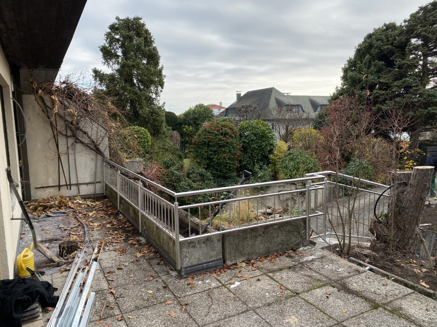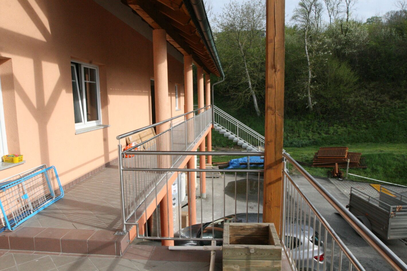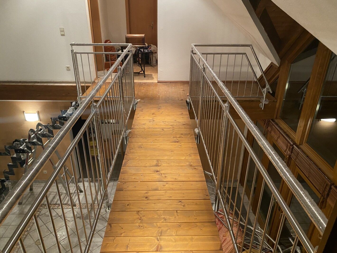 Sicherheit und Formschönheit: Bei diesem Treppengeländer werden vertikale Geländerstäbe, mit einem max. Stababstand von 12 cm kindersicher aus hochwertigem Edelstahl zwischen Ober,- und Unterzug voll verschweißt.