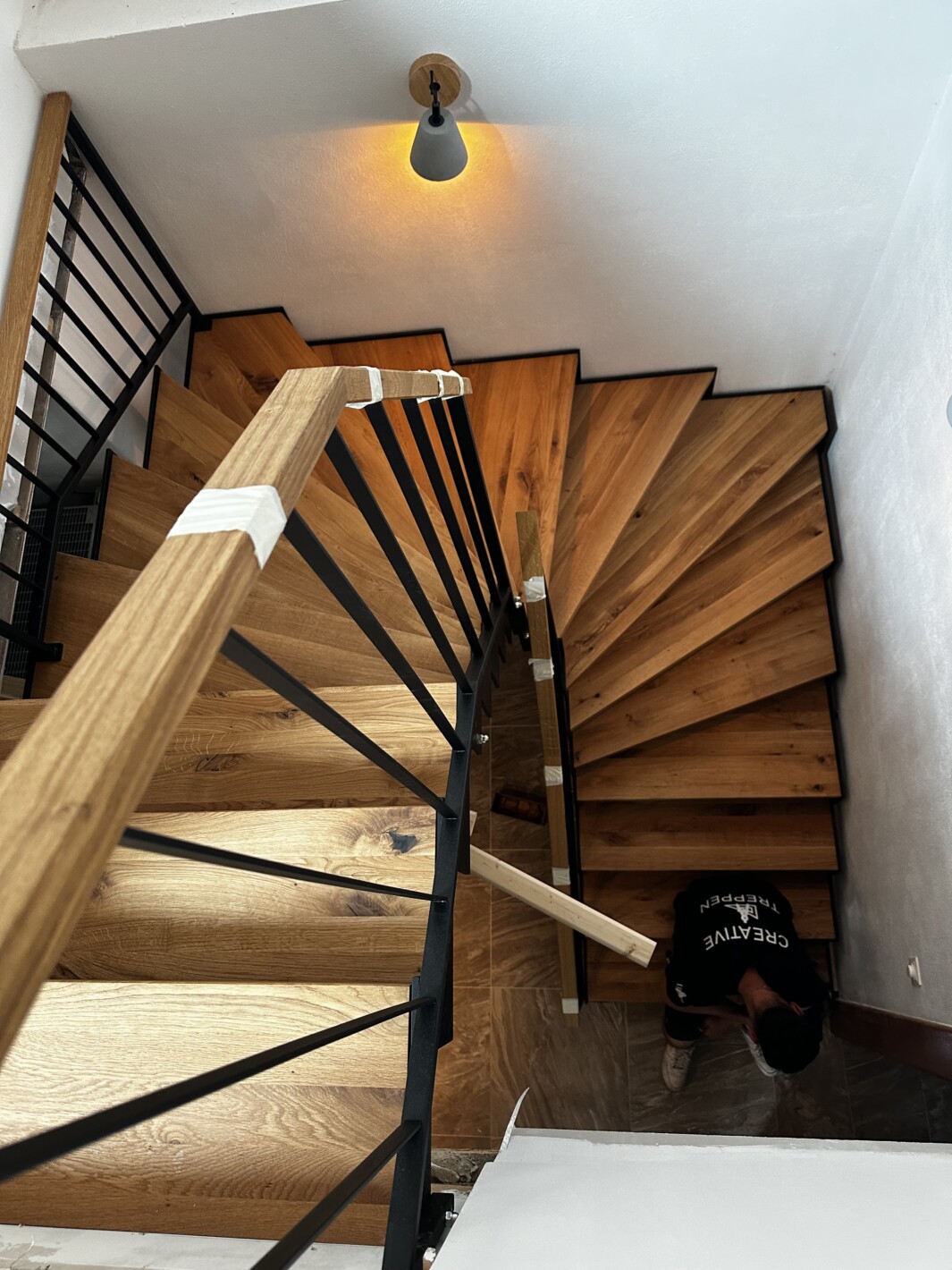 Stahlwangentreppe abgetreppt Matt Schwarz pulverbeschichtet, 1/2 gewendelt, Trittstufen Eiche massiv rustikal, Edelstahl Stabgeländer matt schwarz pulverbeschichtet mit Eichenhandlauf
