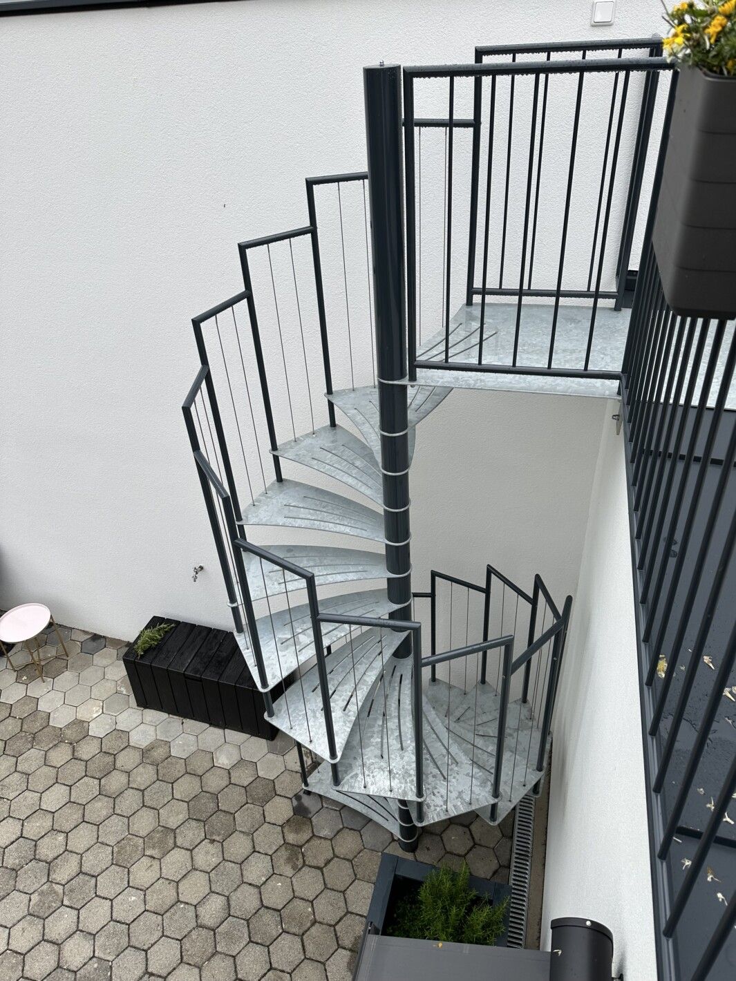 Aus Edelstahl und mit feuerverzinkten Stufen gefertigt, ist die Außen-Spindeltreppe Linz äußerst witterungsbeständig und pflegeleicht. Eine stabile, spindelförmige Außentreppe mit rutschsicheren, gelaserten Trittstufen aus feuerverzinktem Stahl. Dies macht sie zu einer idealen Wahl für den Einsatz in stark frequentierten Bereichen oder in gewerblichen Umgebungen.