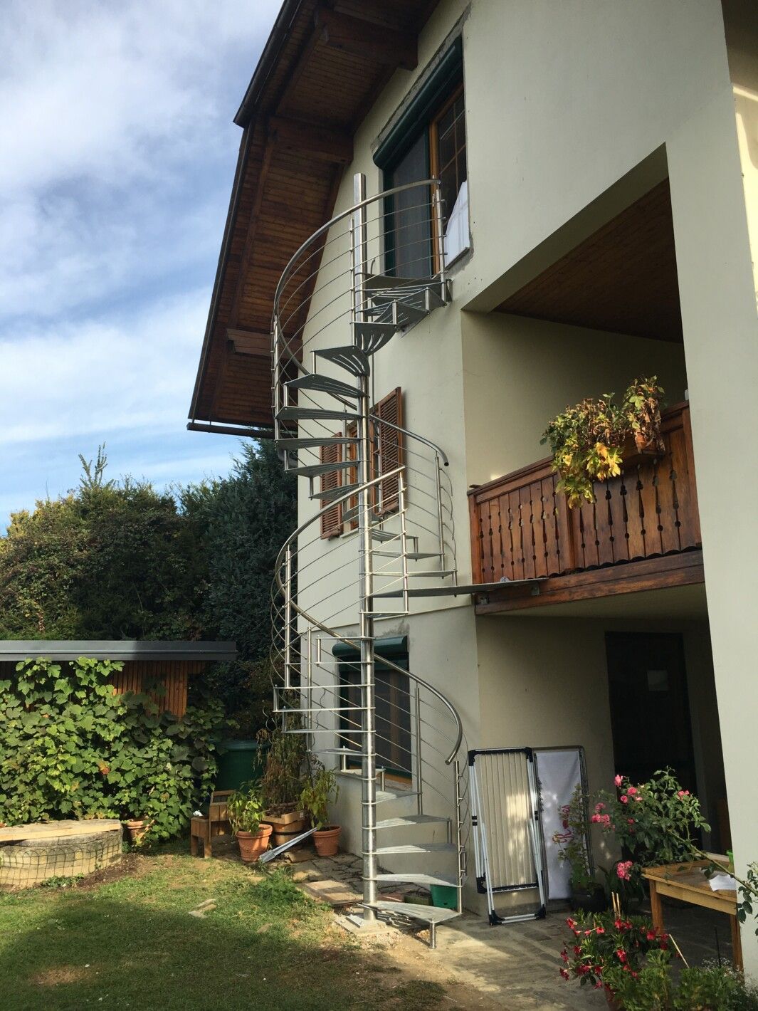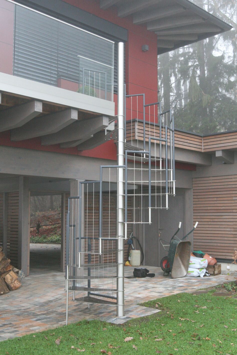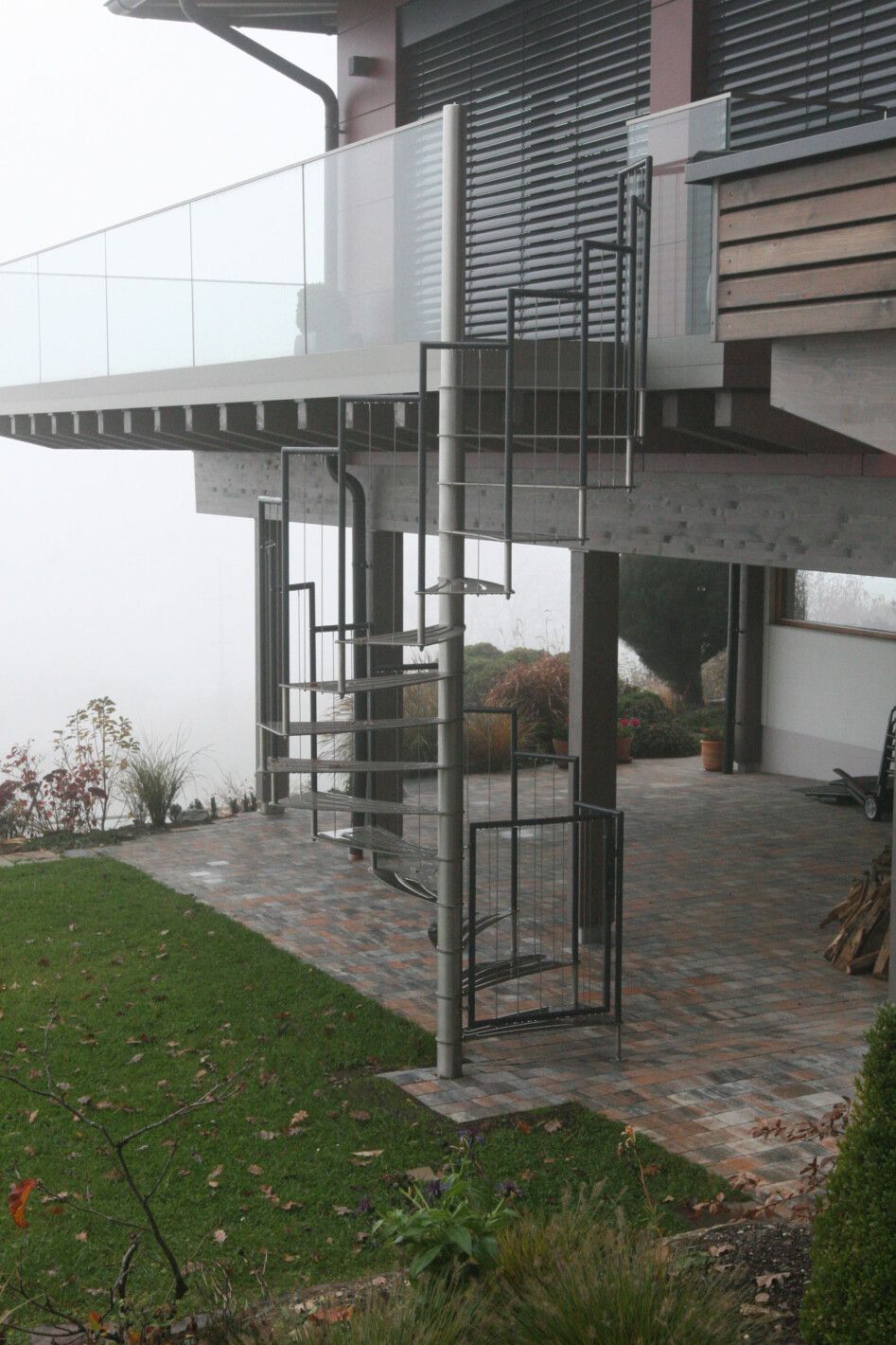 - Geländer: Edelstahl in abgetreppter Form mit Edelstahlseilen oder Edelstahlstäben