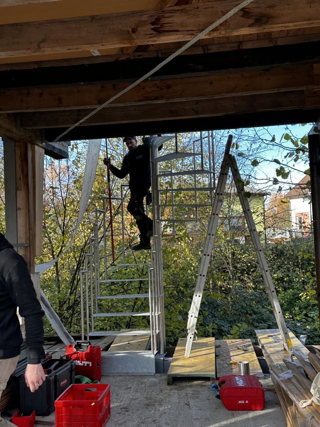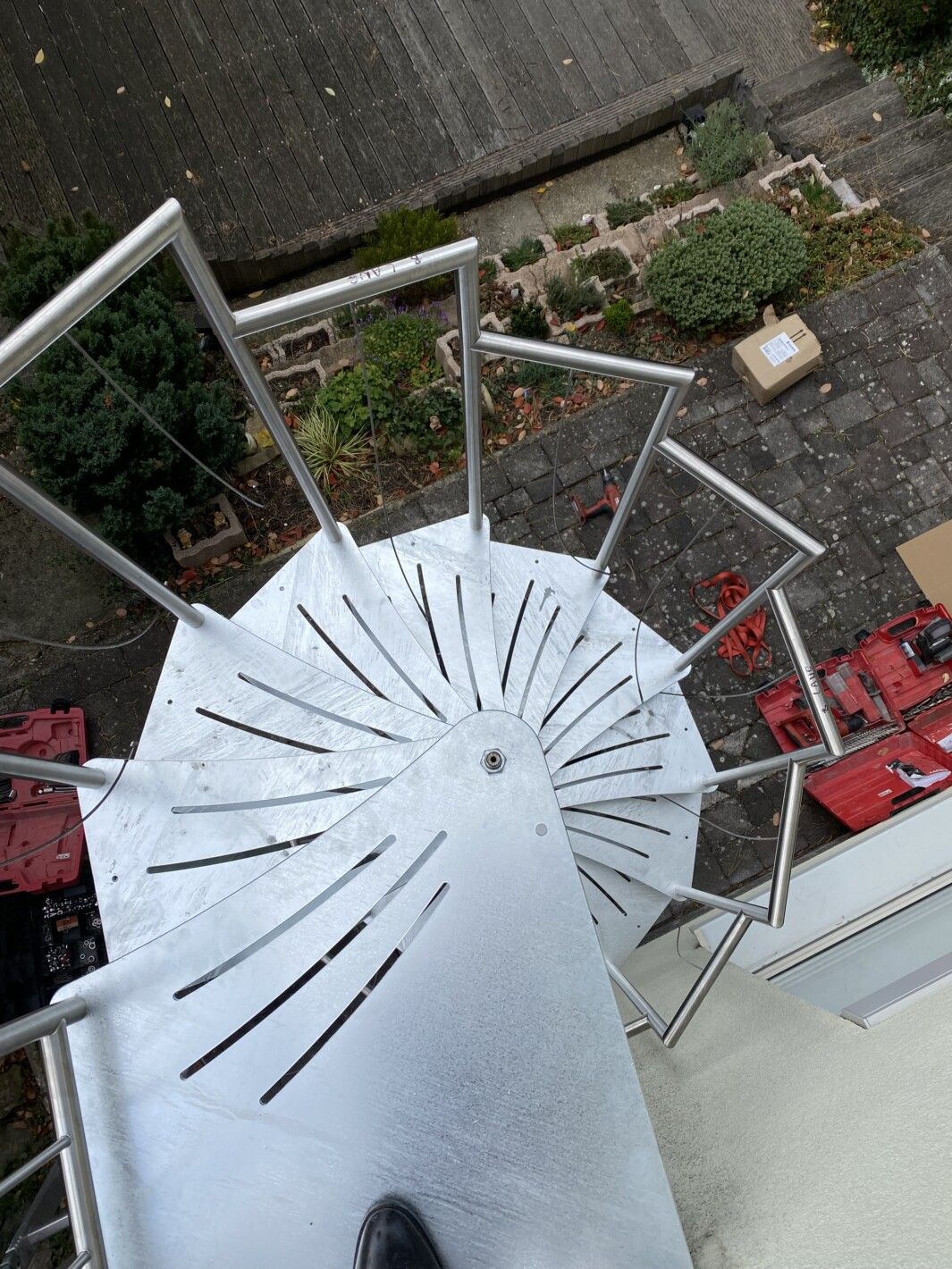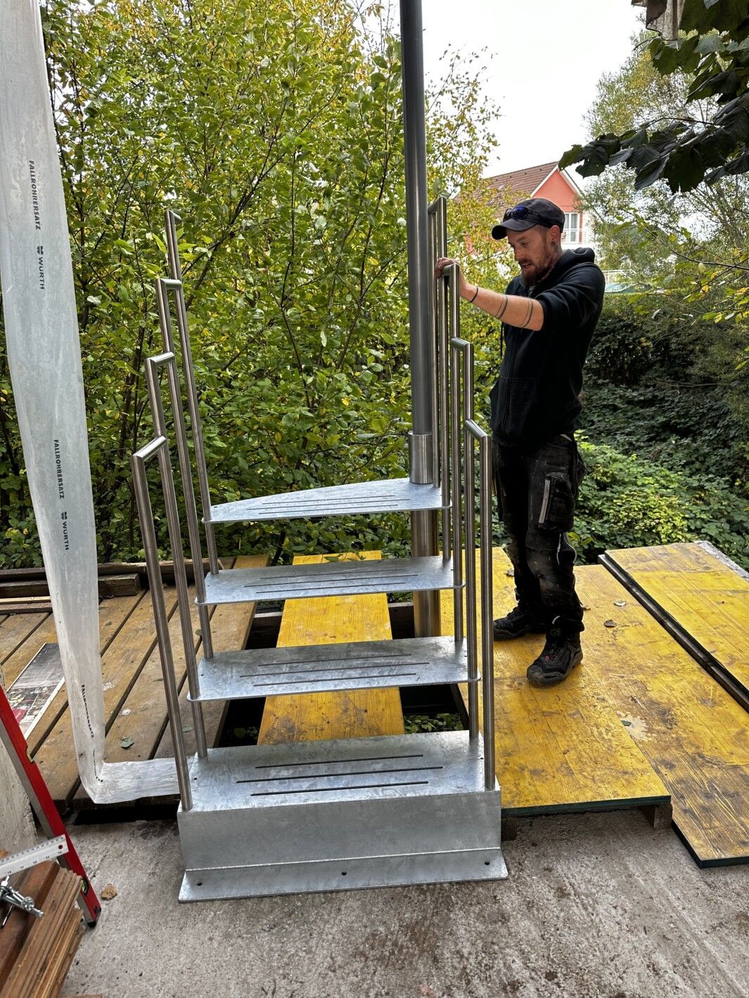 - Material Trittstufen und Podest: gelasert aus 8 mm Stahl massiv feuerverzinkt